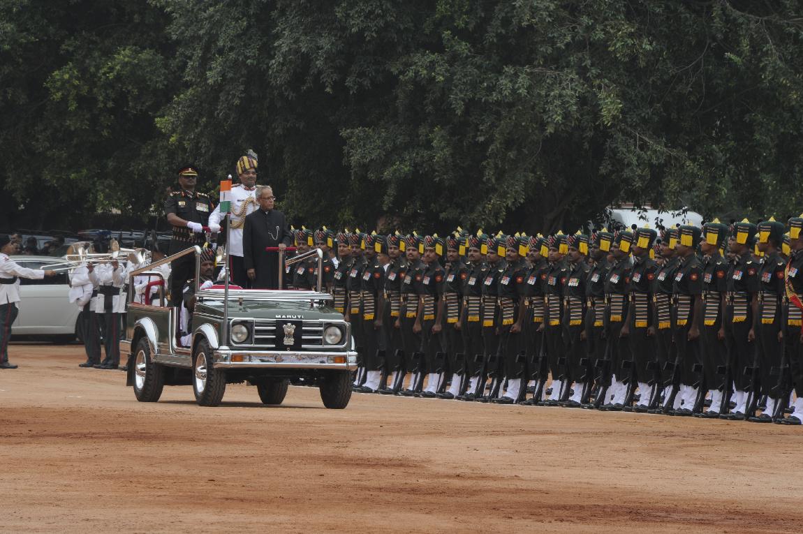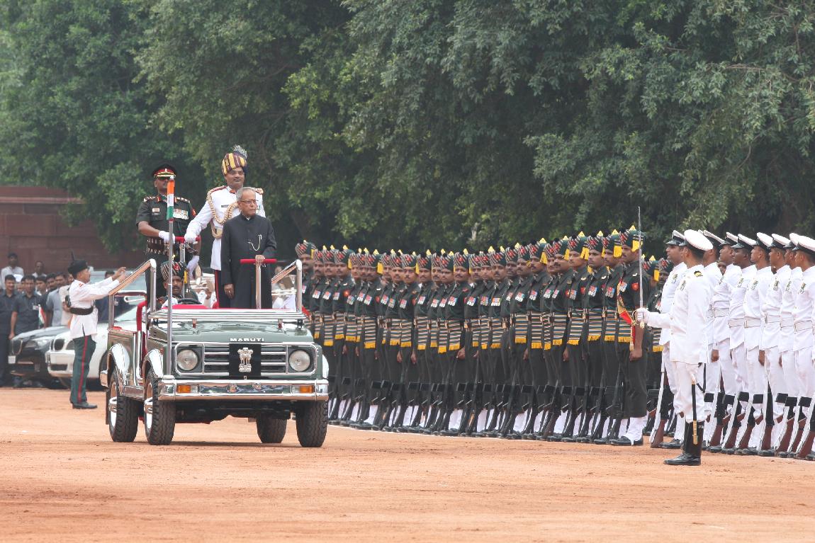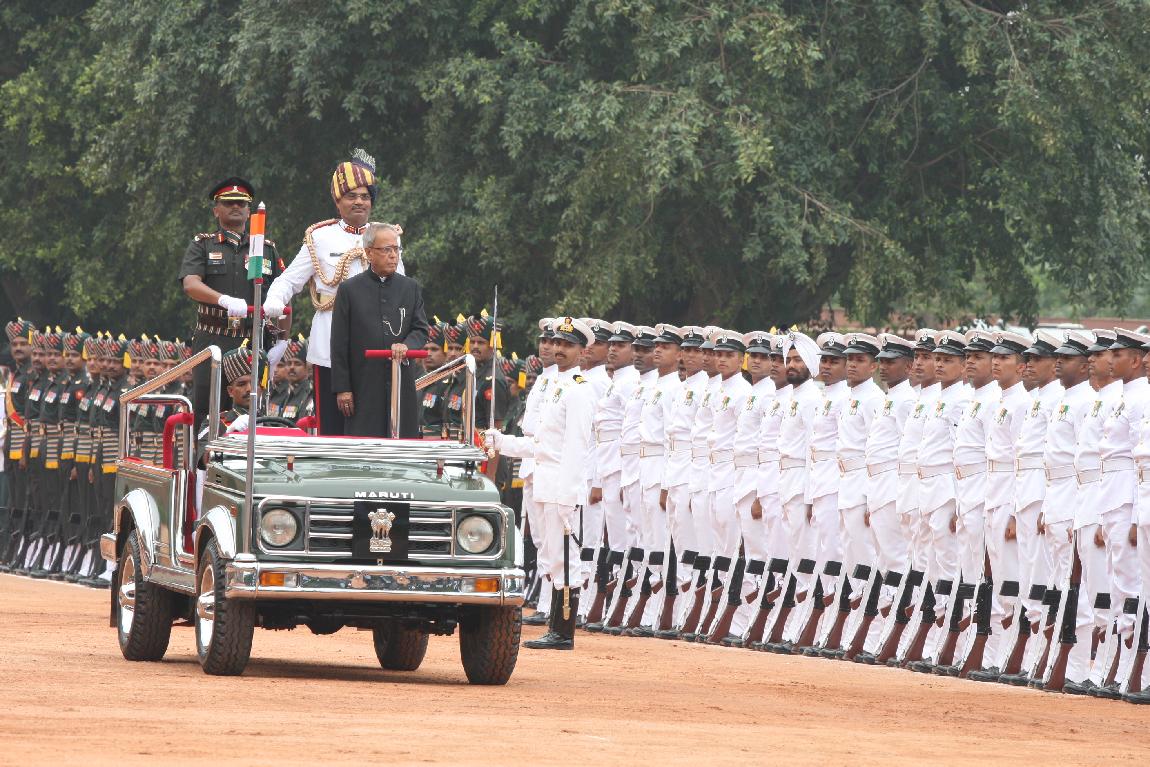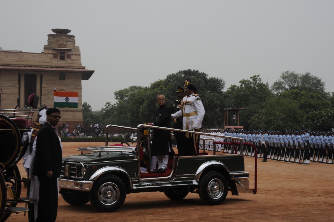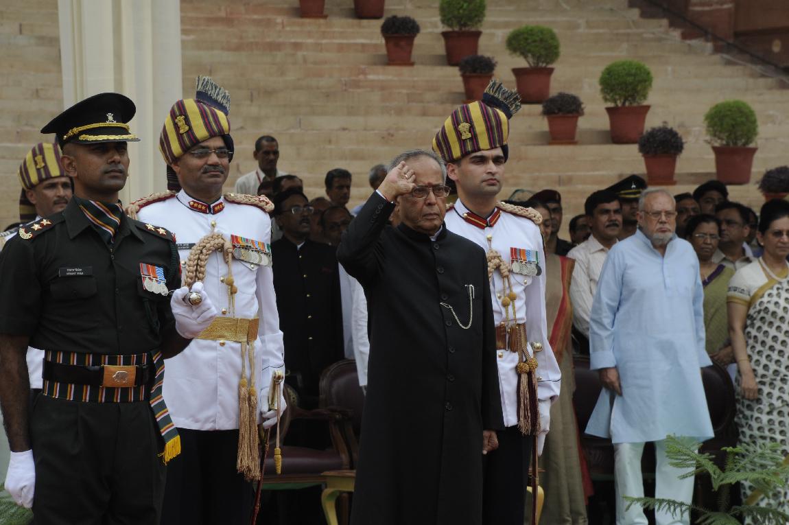 | Caption: | The President of India, Shri Pranab Mukherjee inspecting the Guard of Honour at Fore Court on July 25, 2012 |
