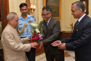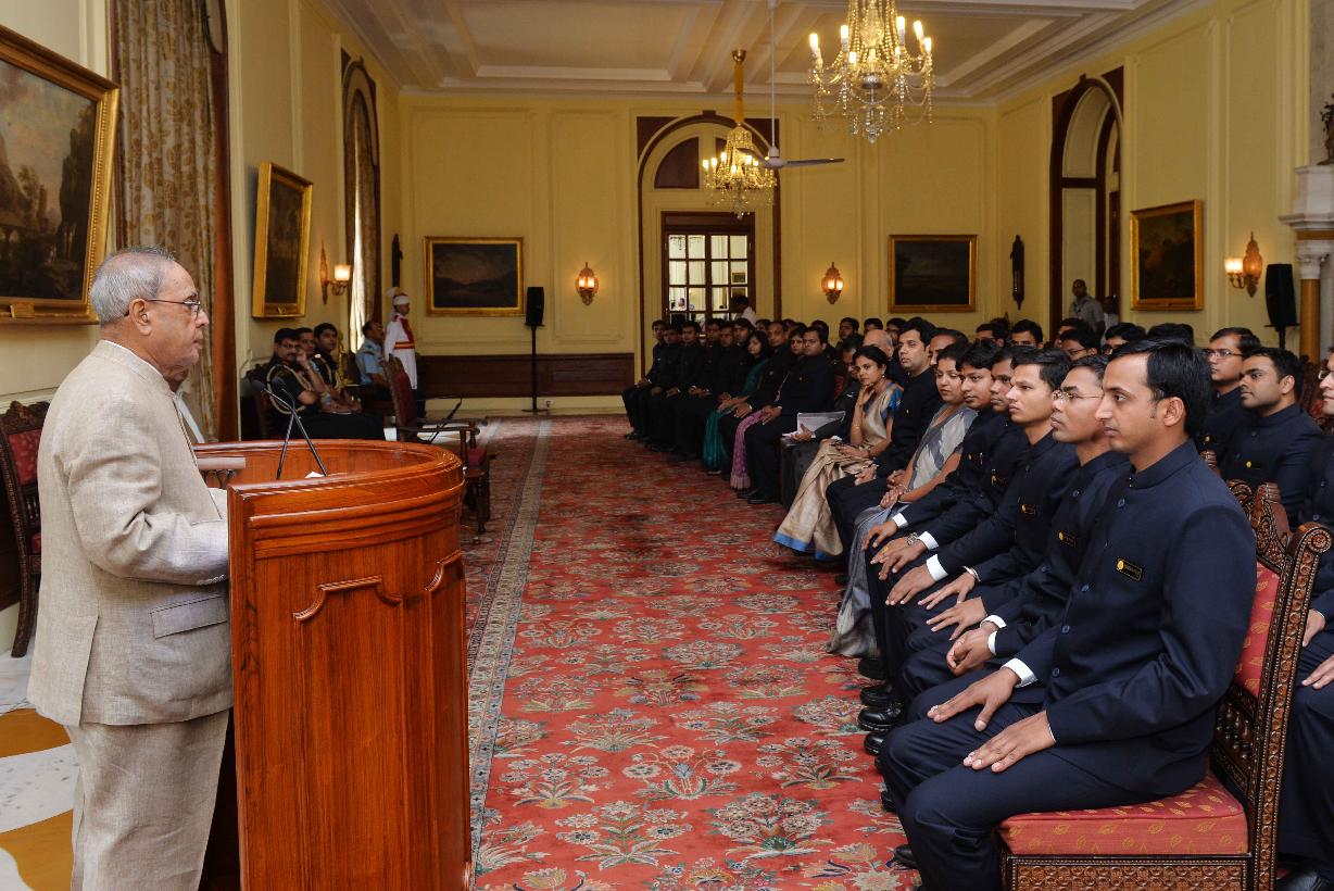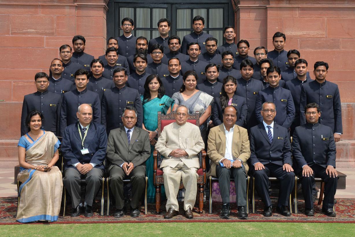 | Caption: | The President of India, Shri Pranab Mukherjee meeting with the Probationary Officers of Indian Ordnance Factories Service (IOFS) of 2014 (i) Batch from National Academy of Defence Production (NADP), Nagpur, at Rashtrapati Bhavan, in New Delhi on April 24, 2015. |