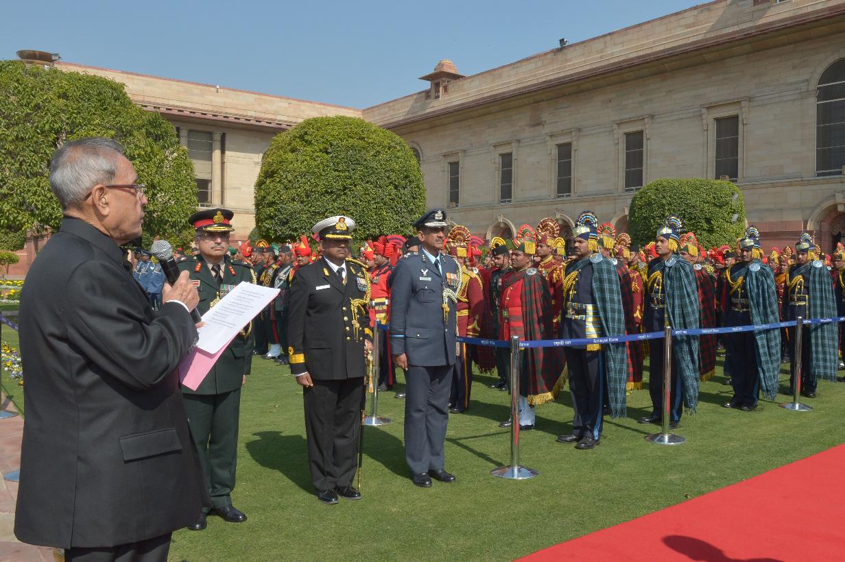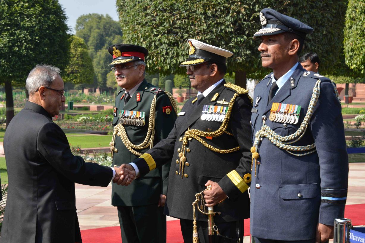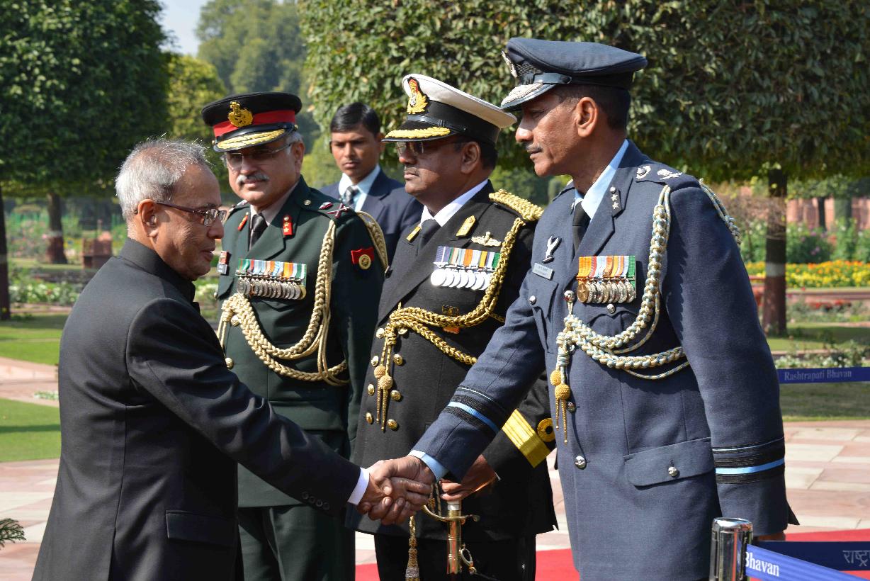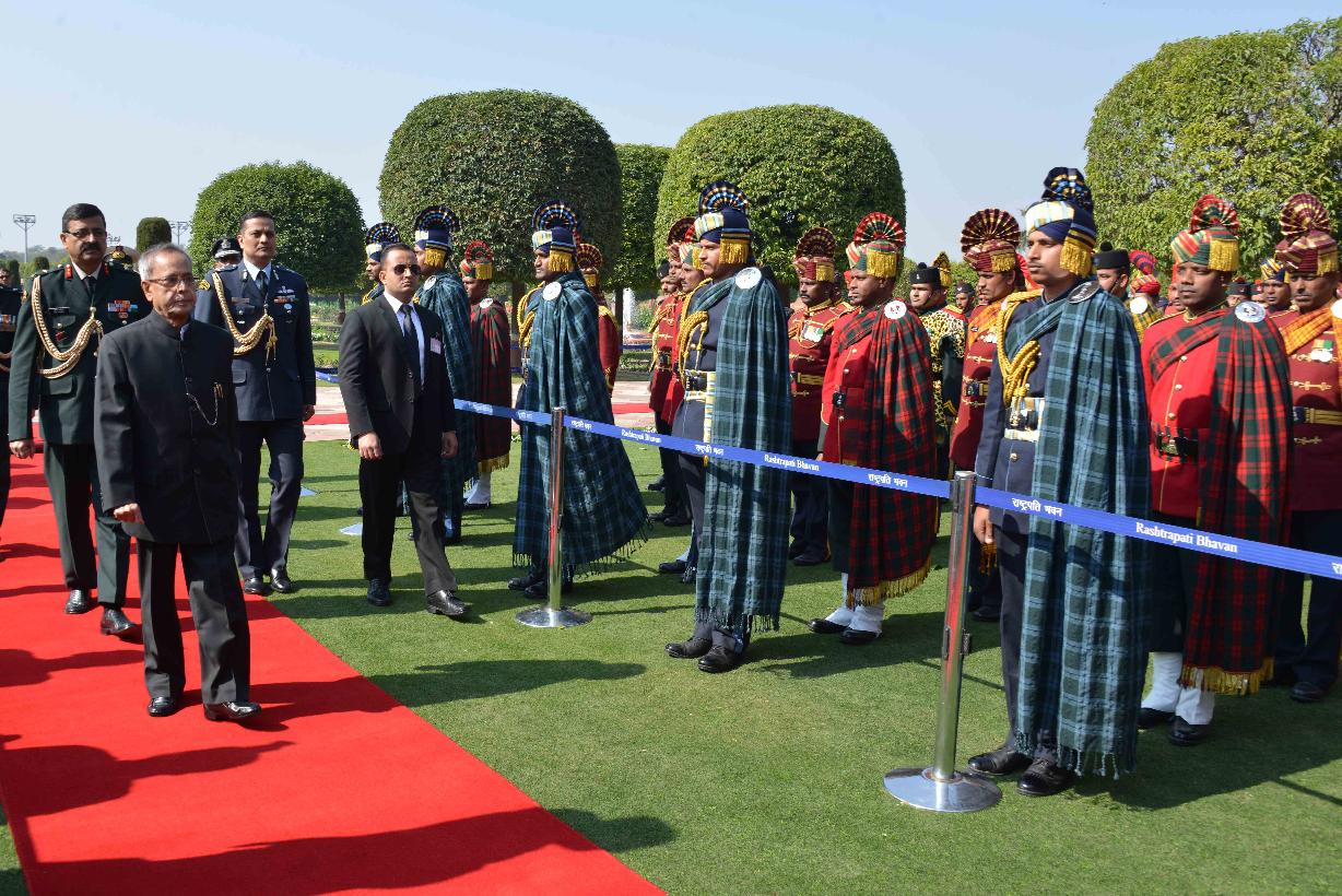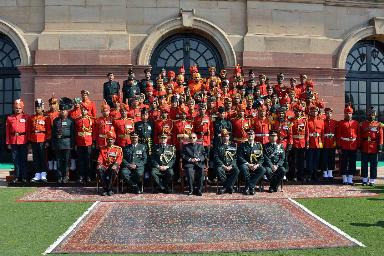| Caption: | The President of India, Shri Pranab Mukherjee meeting with the personnel Tri Service Band Contingents (participants of the Beating Retreat Ceremony) and Provost Outriders of the Three Services, at Rashtrapati Bhavan, in New Delhi on January 30, 2015. |