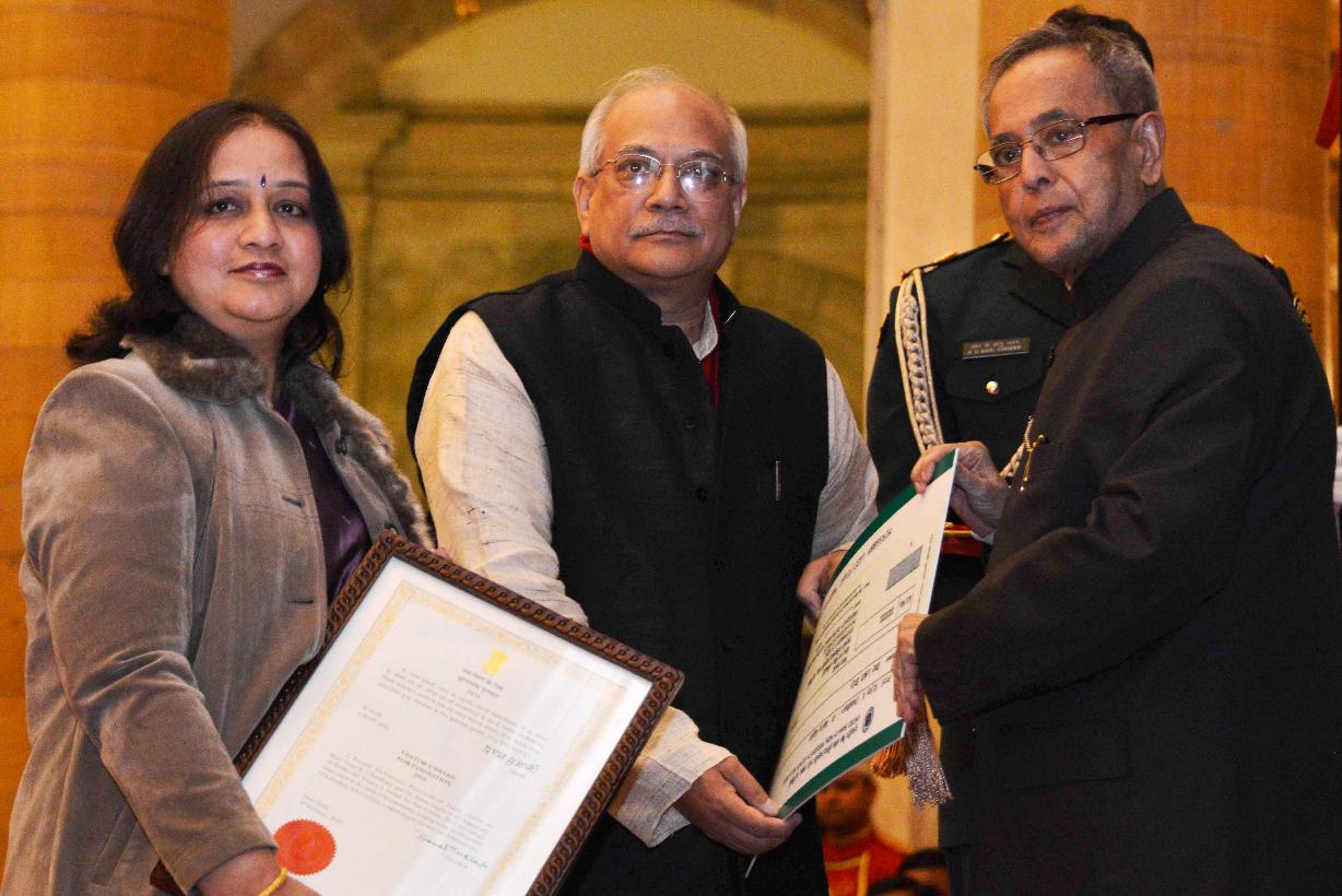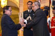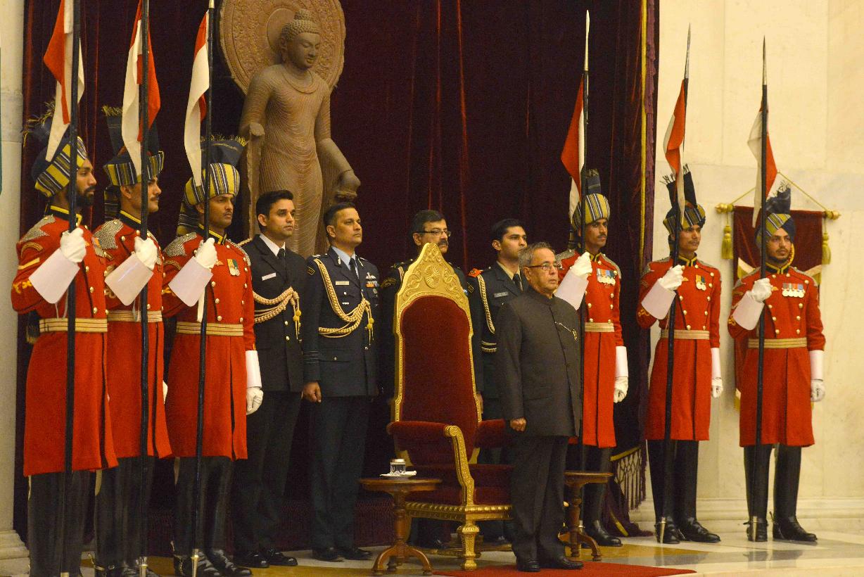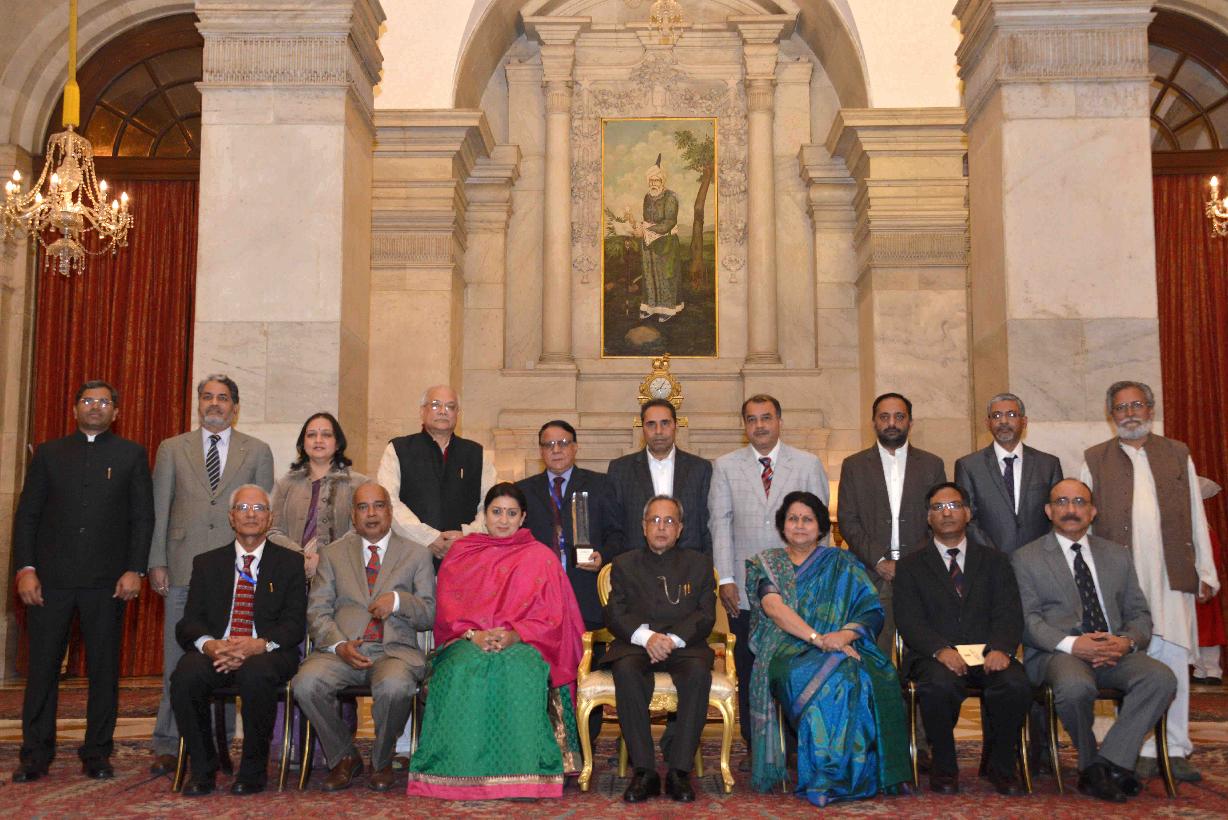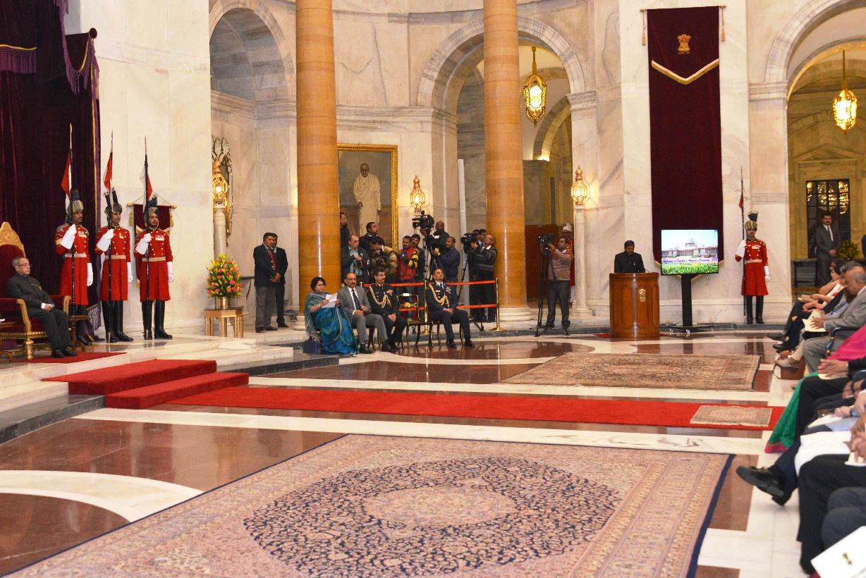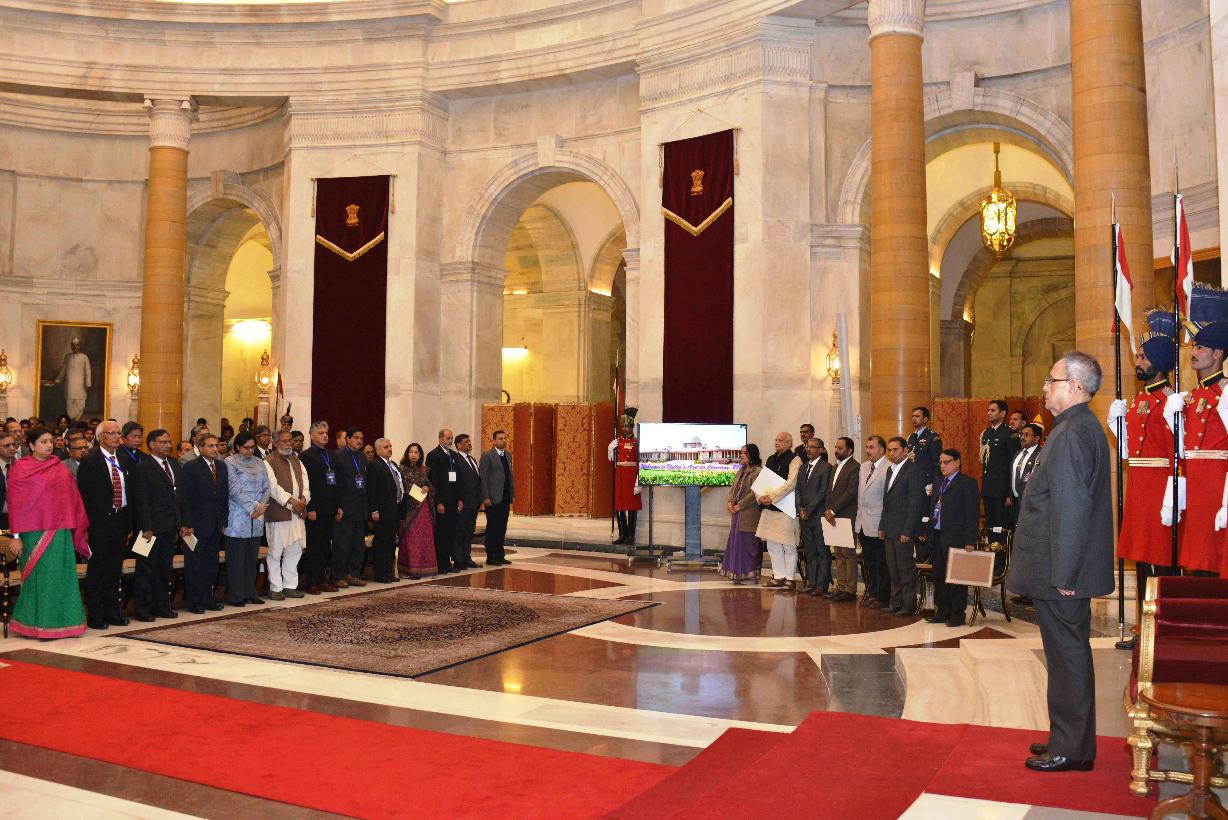 | Caption: | The President of India, Shri Pranab Mukherjee, presenting First Visitor s Award 2015, at Rashtrapati Bhavan, in New Delhi on February 04, 2015. |