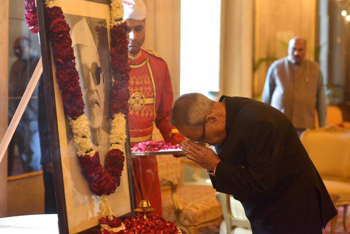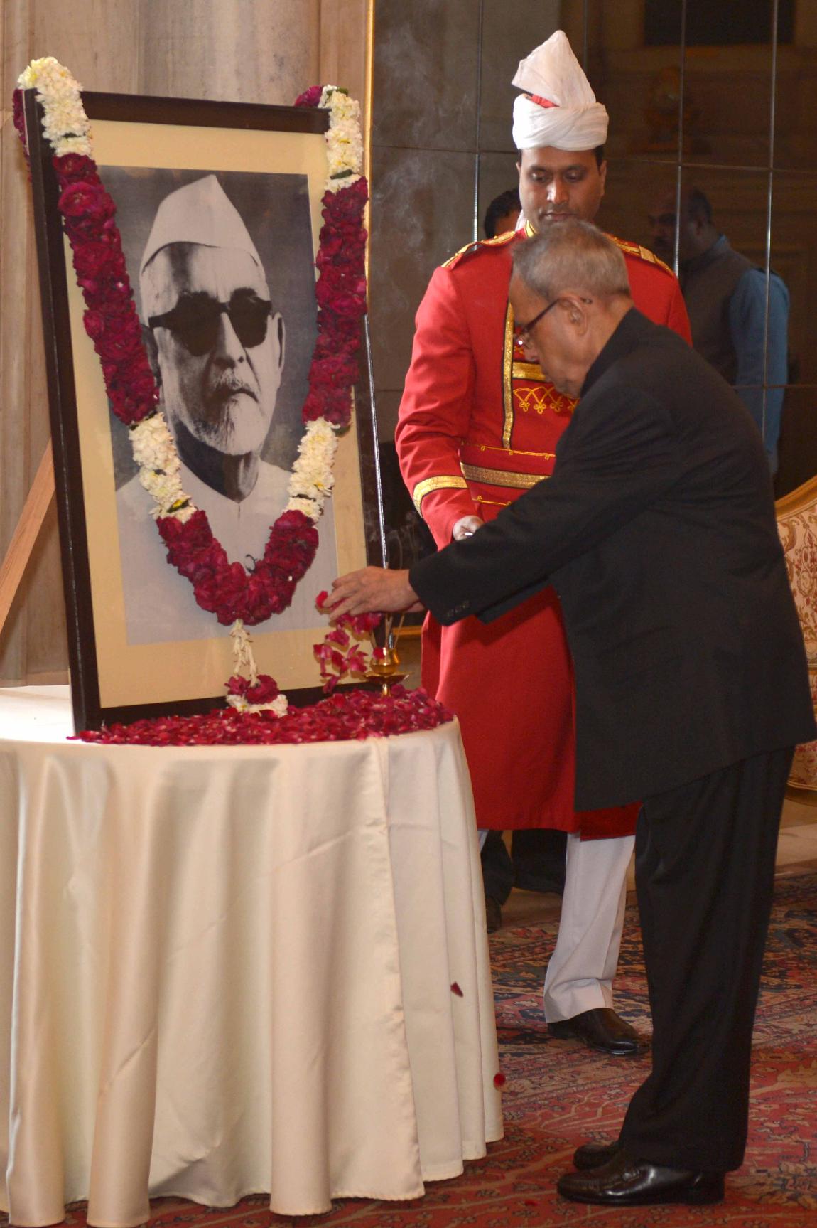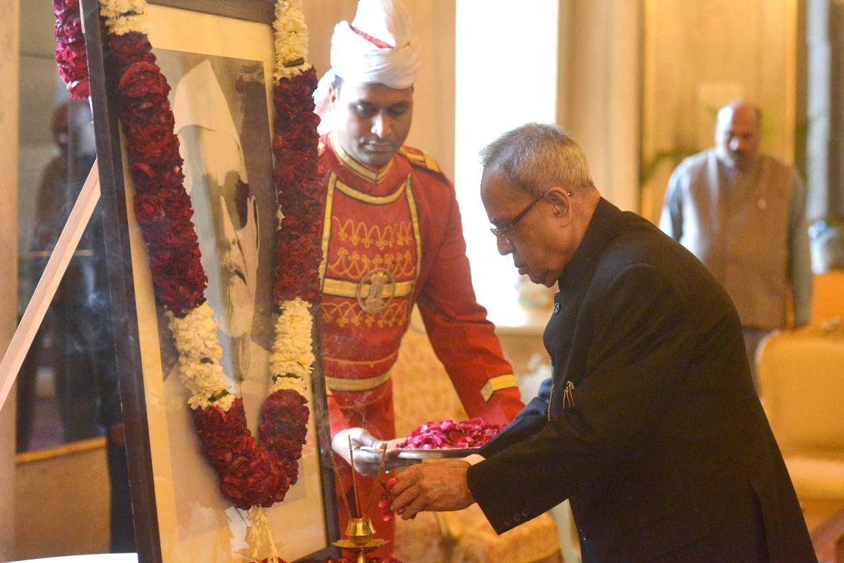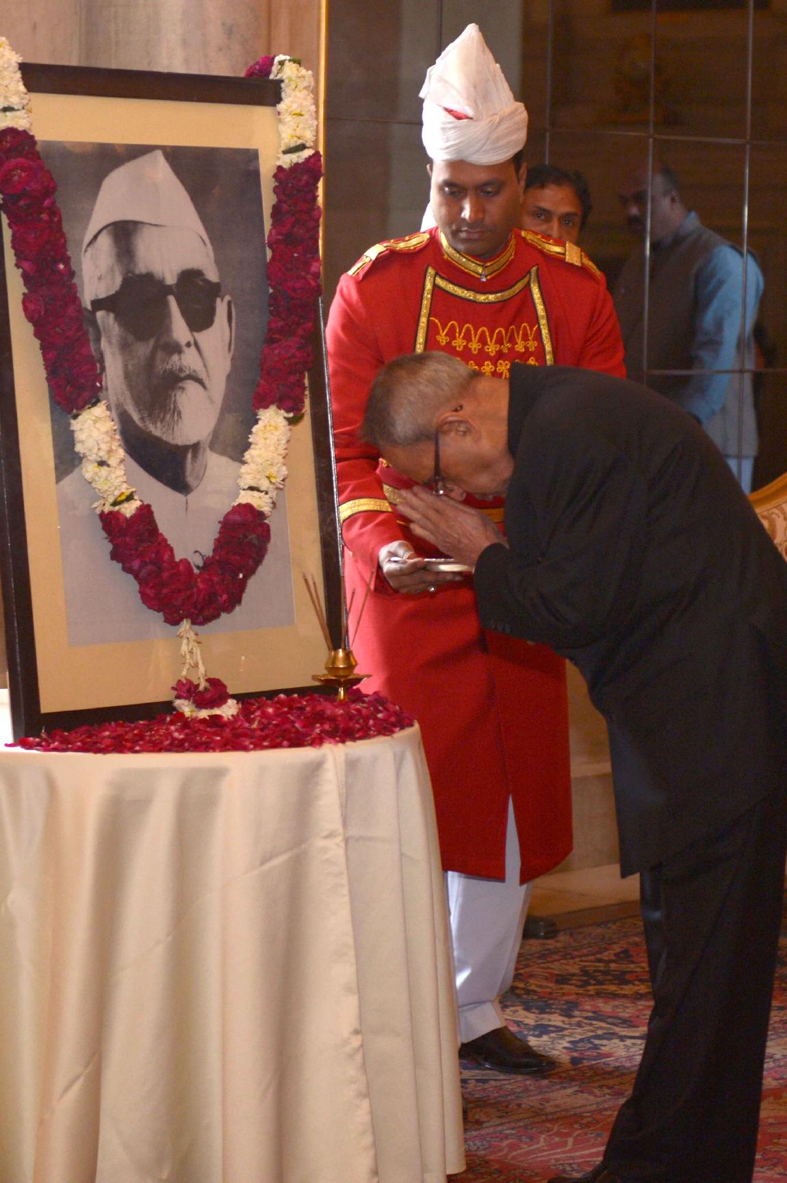 | Caption: | The President of India, Shri Pranab Mukherjee, paying floral tribute at the Portrait of the former President of India, Dr Zakir Hussain, on the occasion of his Birth Anniversary, at Rashtrapati Bhavan, in New Delhi on February 08, 2015. |