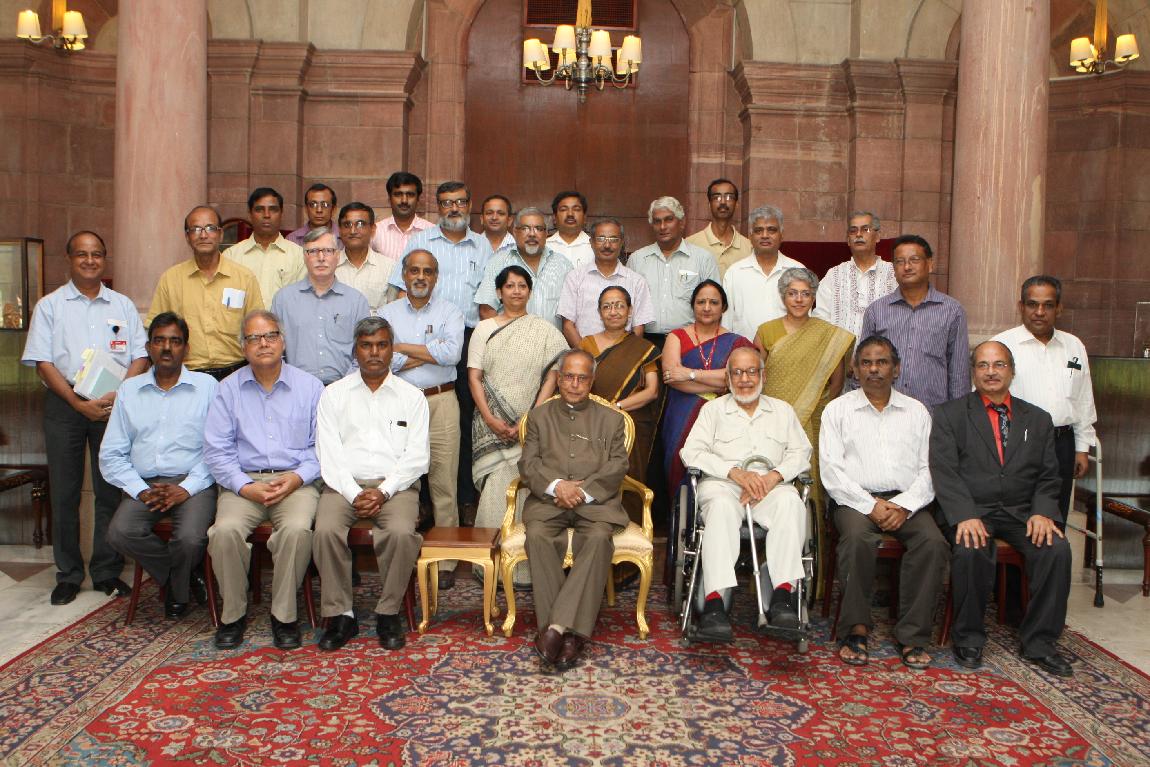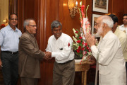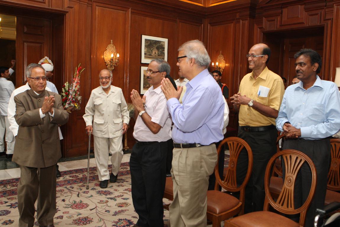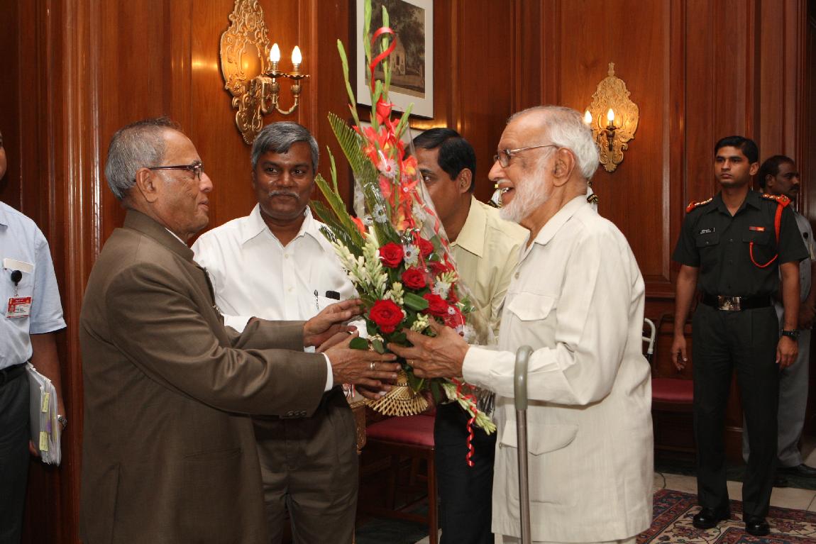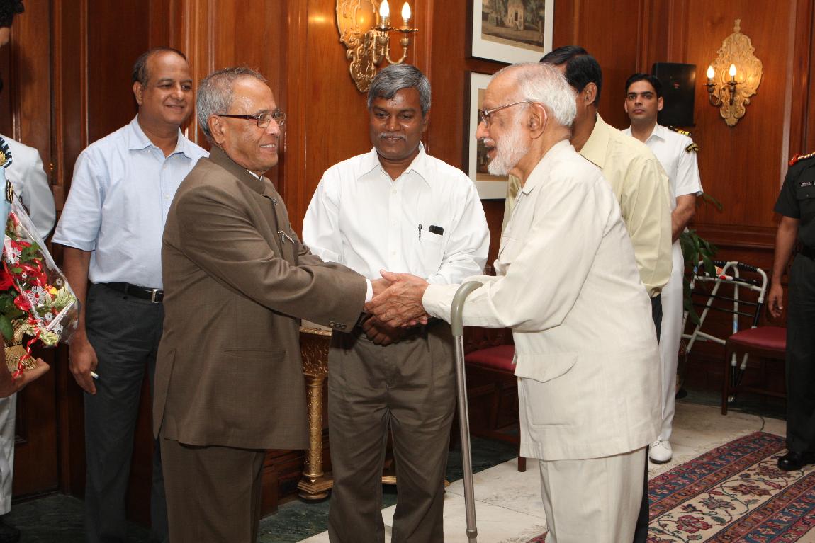 | Caption: | The President of India, Shri Pranab Mukherjee meeting with Prof MGK Menon President & Prof Bimal K Roy Director Indian Statistical Institute Kolkata on July 28, 2012 |