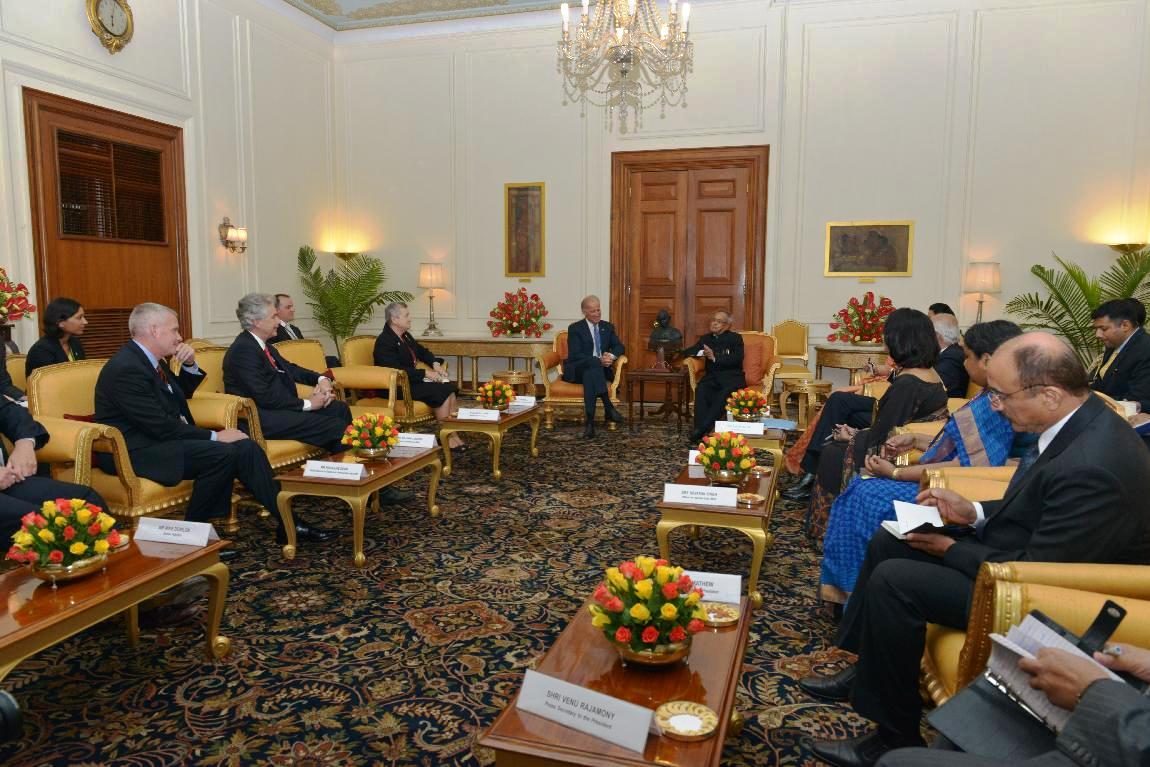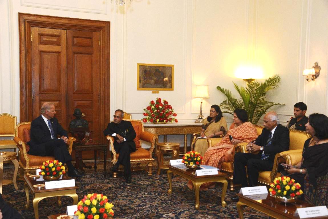 | Caption: | The President of India, Shri Pranab Mukherjee Call by the Honorable Mr Joseph R Biden Jr, Vice President of the United States of America with Delegation at Rashtrapati Bhavan on July 23, 2013 |