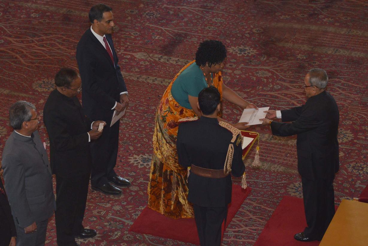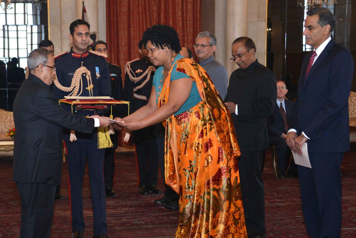| Caption: | HE Mrs Regine Katabarumwe, Ambassador-designate of Burundi presenting her Credential to the President of India, Shri Pranab Mukherjee at Rashtrapati Bhavan, in New Delhi on January 16, 2015 |