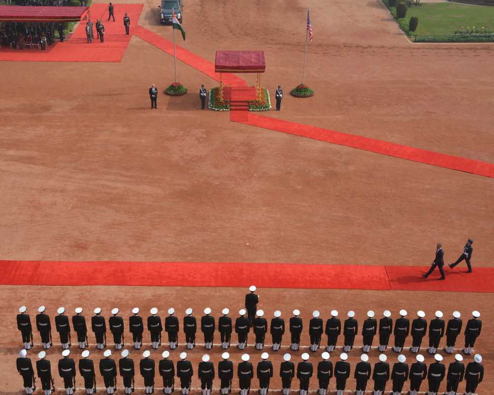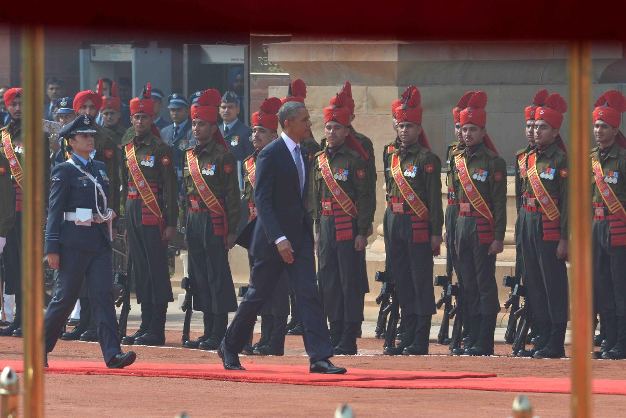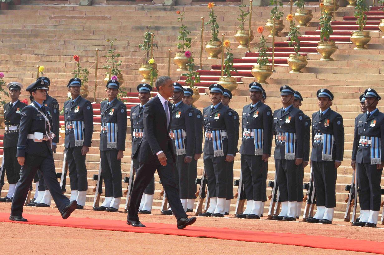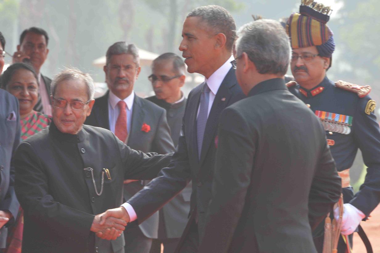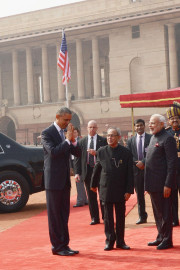 | Caption: | The President of India, Shri Pranab Mukherjee receiving the President of the United States of America, HE Mr Barack Obama during his Ceremonial Reception at the forecourt of Rashtrapati Bhavan, in New Delhi on January 25, 2015. |