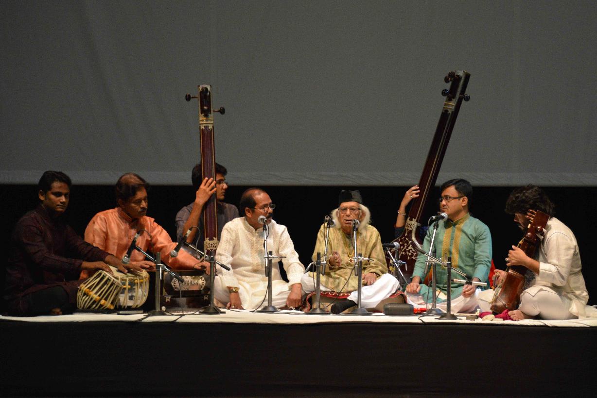 | Caption: | The President of India, Shri Pranab Mukherjee with the artists after witnessing a concert by Ustad Abdul Rashid Khan and group, at Rashtrapati Bhavan Cultural Centre, in New Delhi on May 16, 2015. |