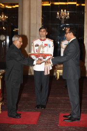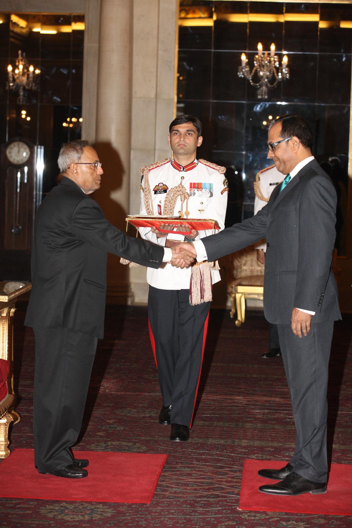 | Caption: | HE Mr Mohamed Naseer, from High Commissioner-designate of The Republic of Maldives presenting his credentials to The President of India, Shri Pranab Mukherjee at Rashtrapati Bhavan on May 09,2013 |