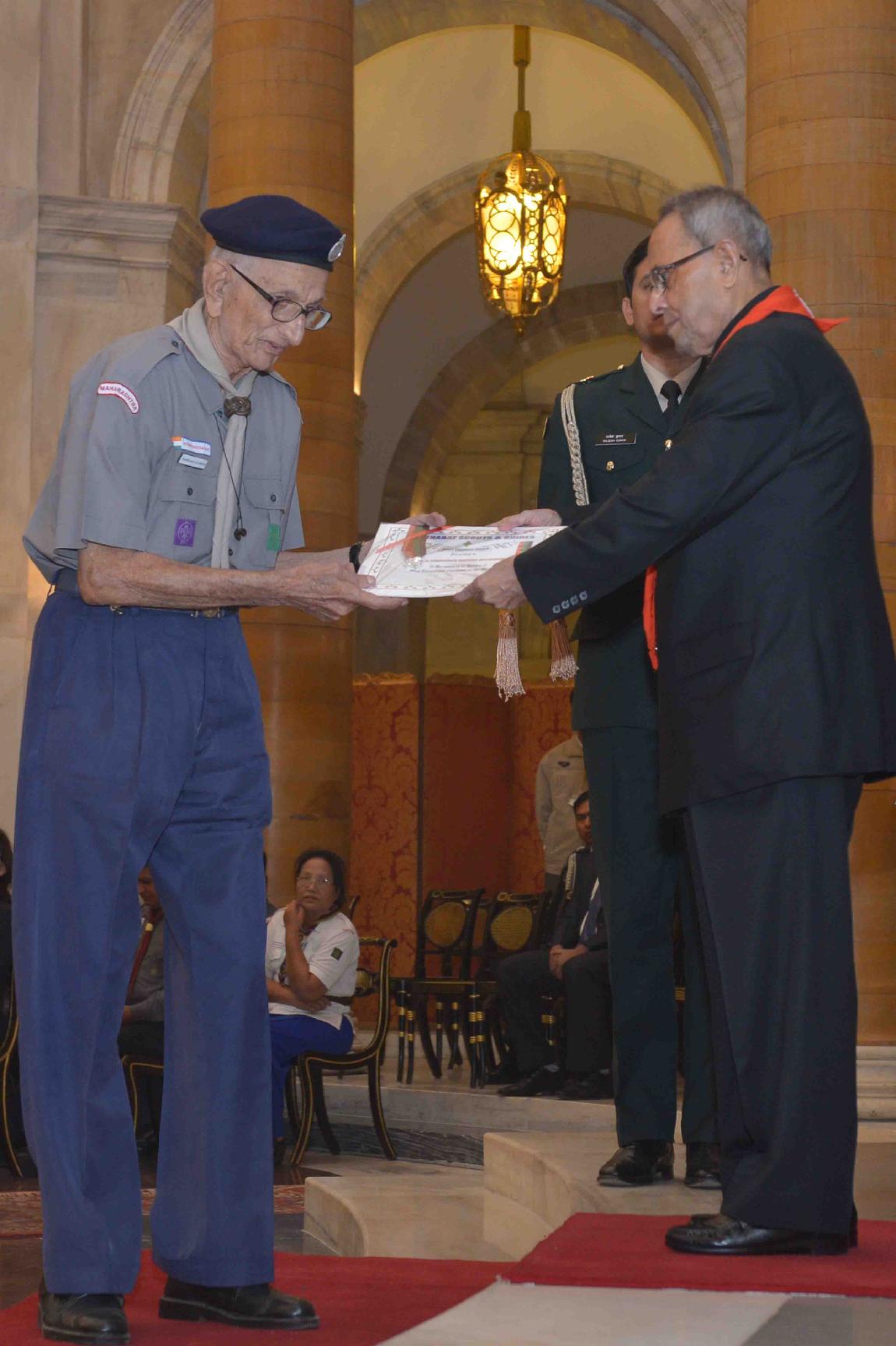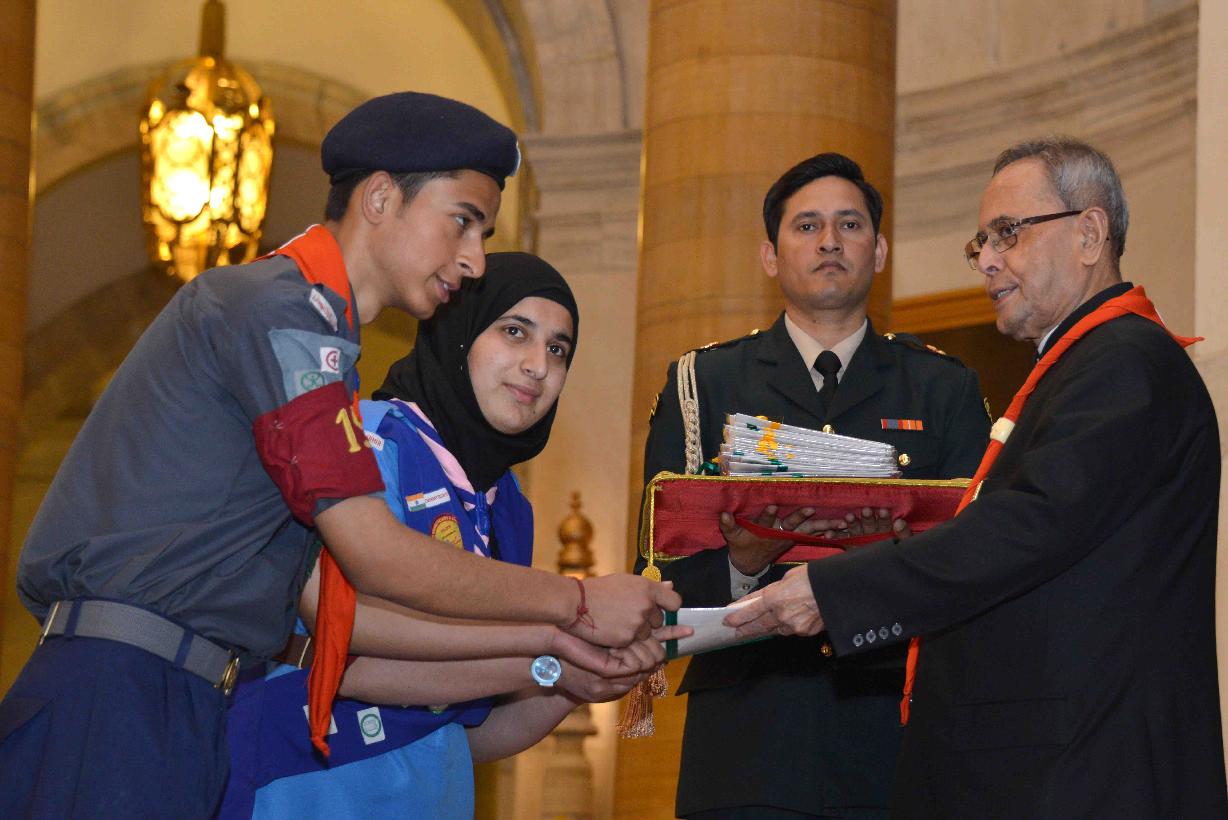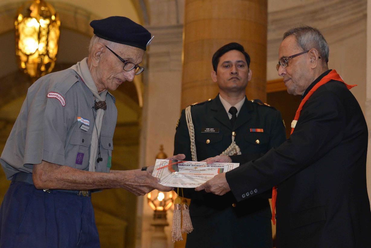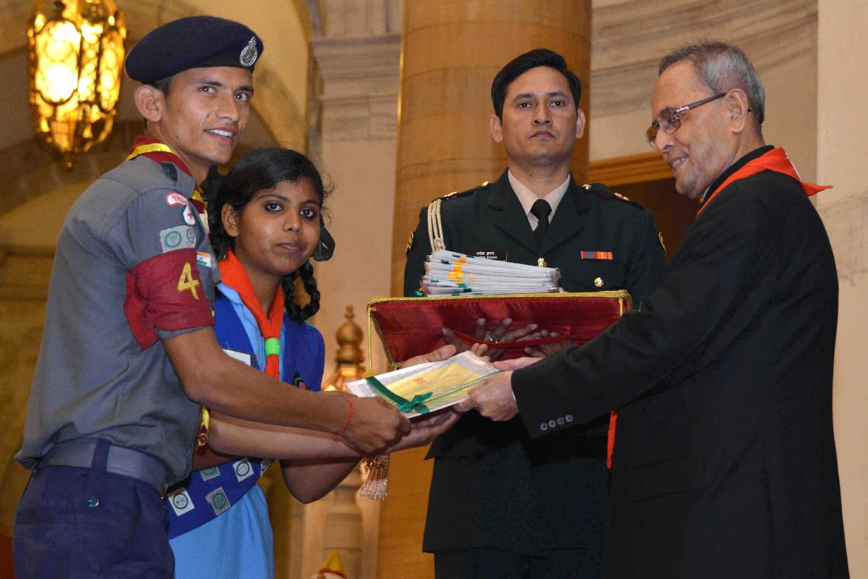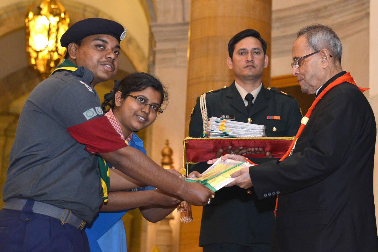 | Caption: | The President of India, Shri Pranab Mukherjee, presenting the Rashtrapati Scouts and Guides Awards Certificates for the year 2013, at Rashtrapati Bhavan, in New Delhi on Feb 16, 2015. |