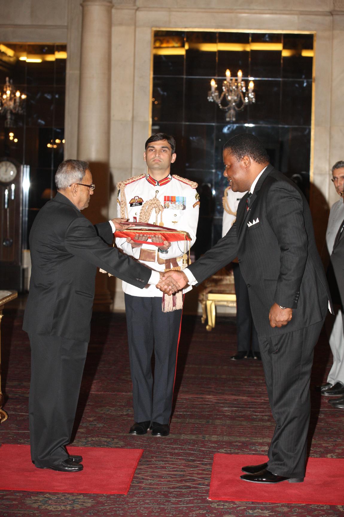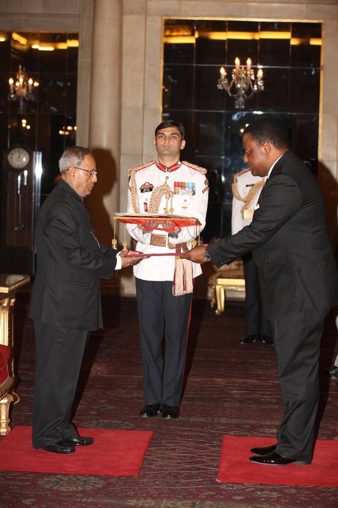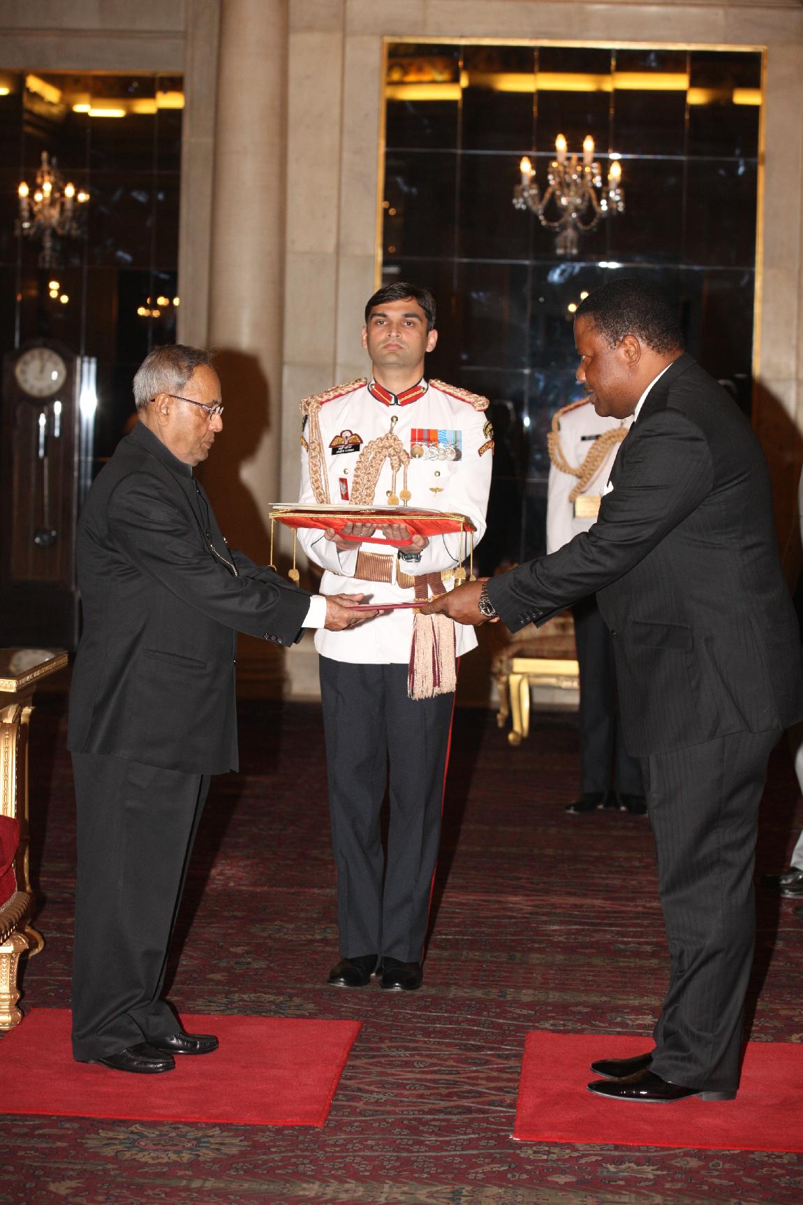 | Caption: | HE Dr Perks Ligoya, from High Commissioner-designate of The Republic of Malawi presenting his credentials to The President of India, Shri Pranab Mukherjee at Rashtrapati Bhavan on May 09,2013 |