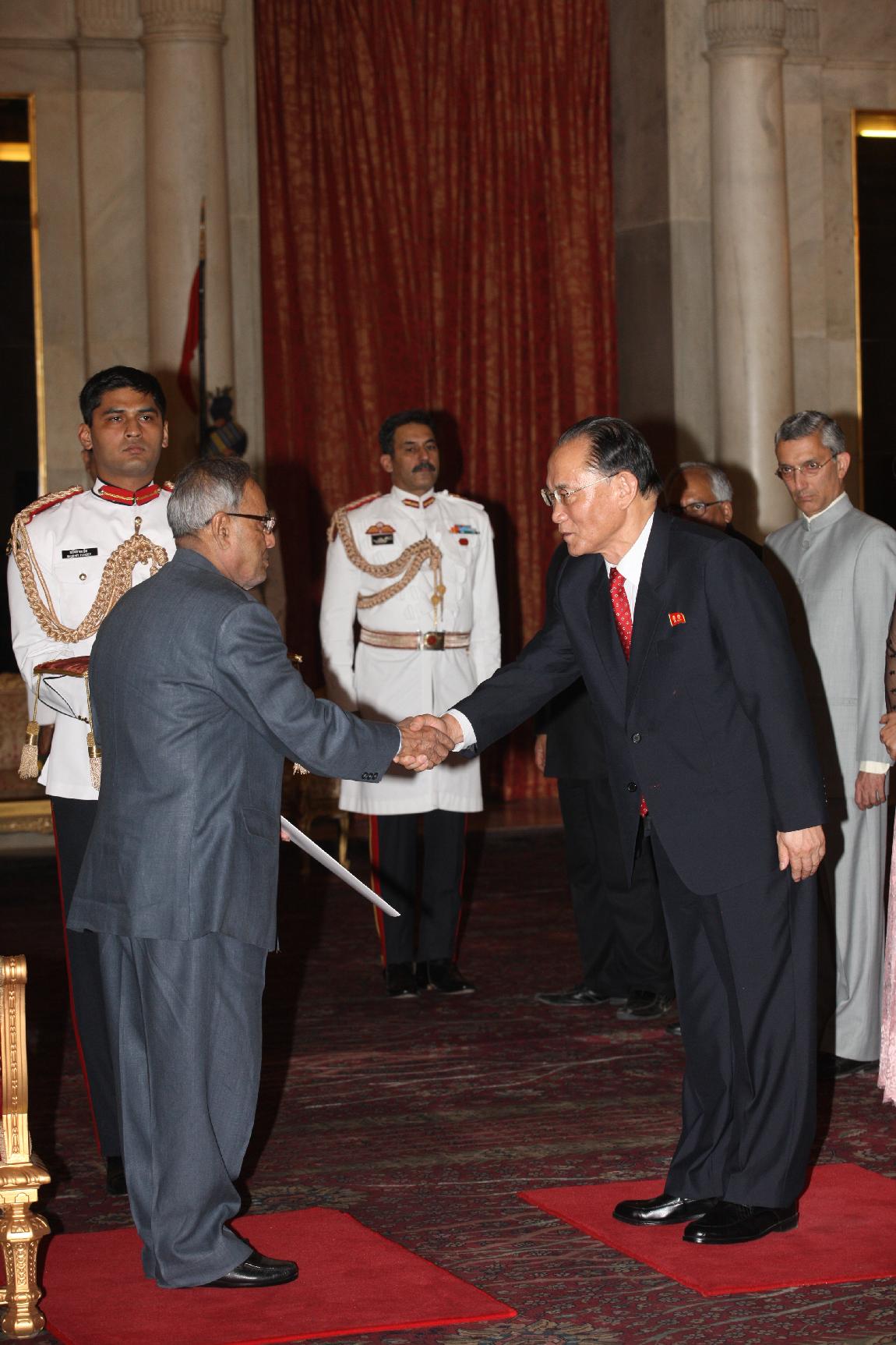| Caption: | HE Mr Pak Kyong Son, from Ambassador-designate of The Democratic People s Republic of Korea presenting his credentials to The President of India, Shri Pranab Mukherjee at Rashtrapati Bhavan on May 28,2013 |
