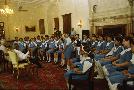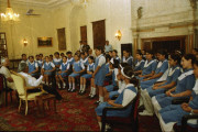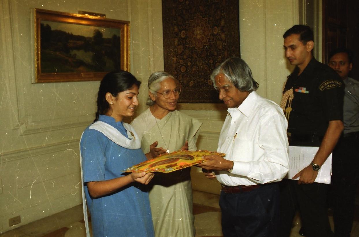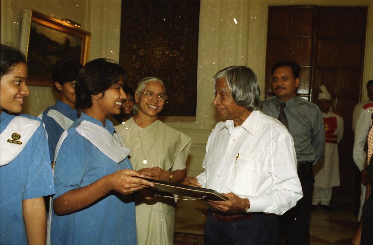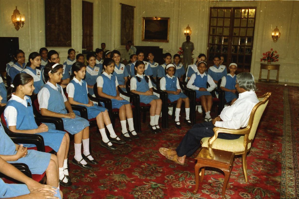 | Caption: | The President of India, Dr A P J Abdul Kalam meeting with the Students and Staff from Mater Dei School, Tilak Lane at the Yellow Drawing Room of Rashtrapati Bhavan in New Delhi on Oct 31, 2002 |