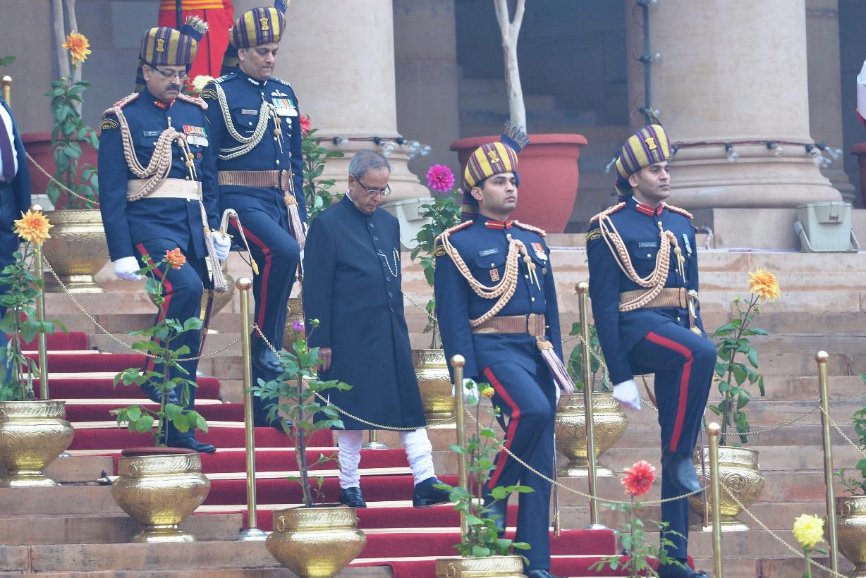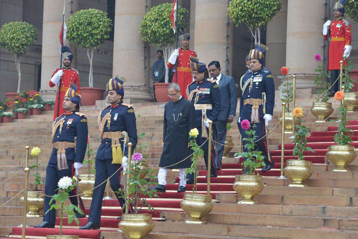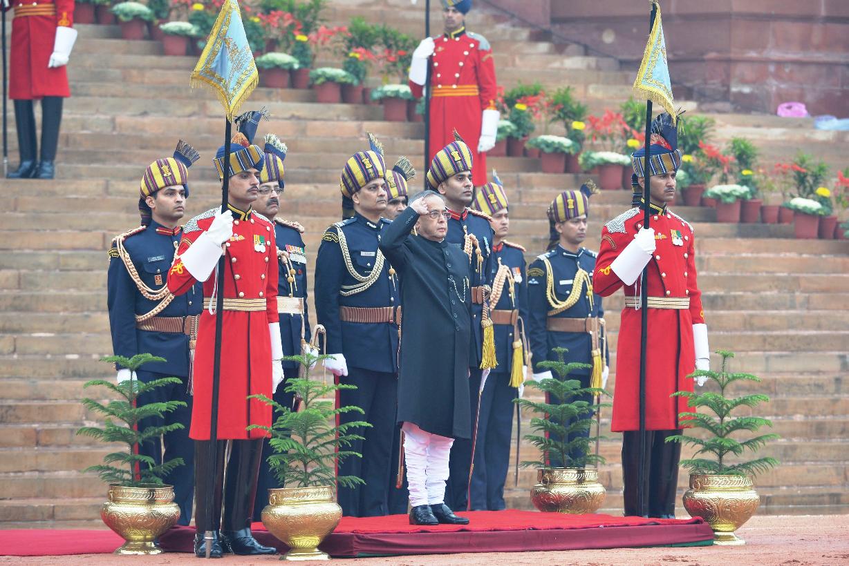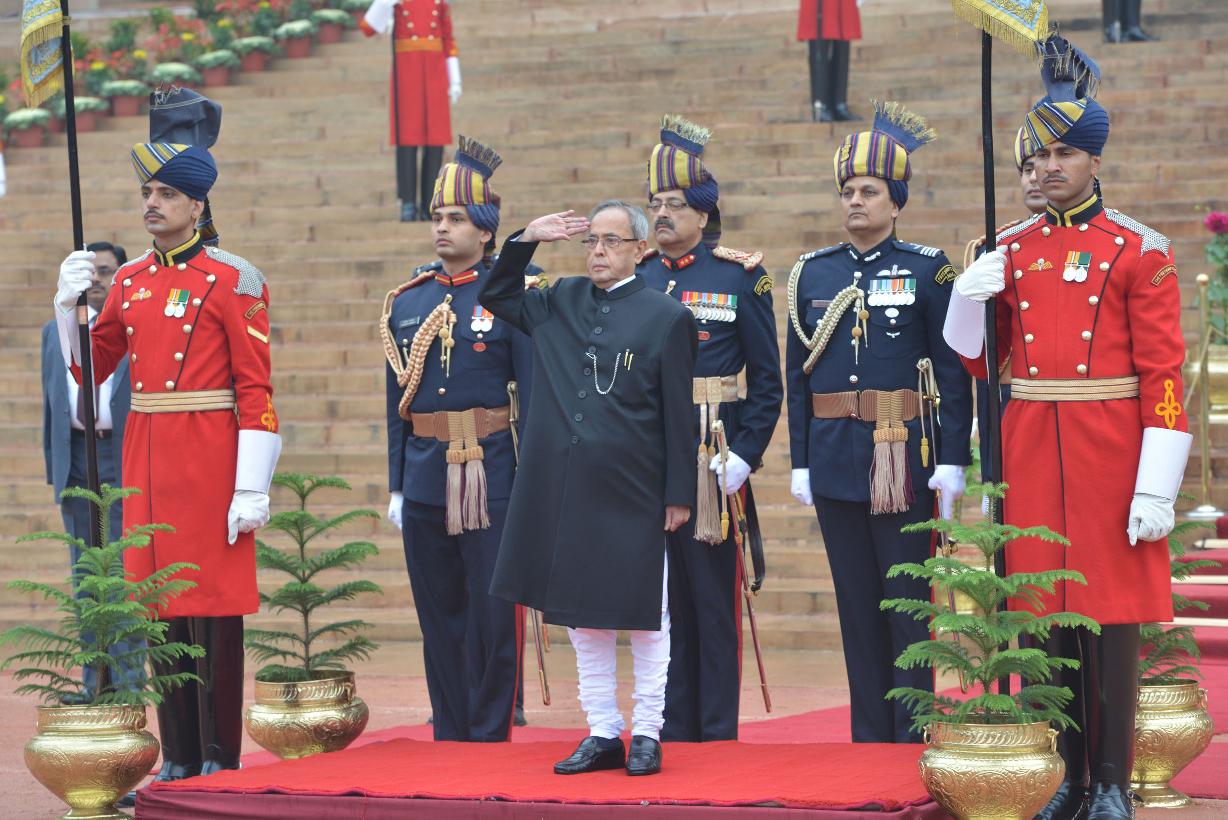 | Caption: | The President of India Shri Pranab Mukherjee taking the salute during departure at the Forecourt of Rashtrapati Bhavan for attending the 66th Republic Day Parade at Rajpath, in New Delhi on January 26, 2015 |
