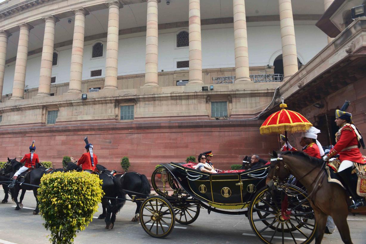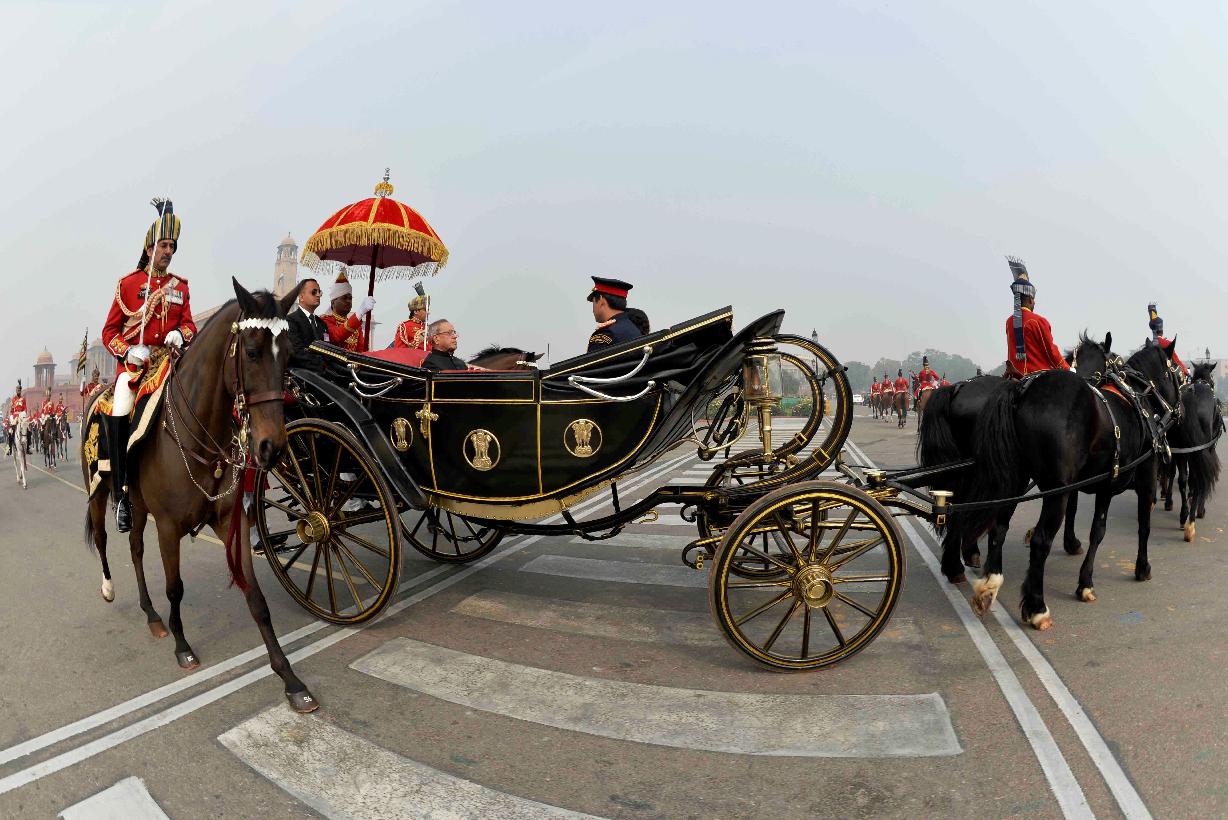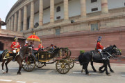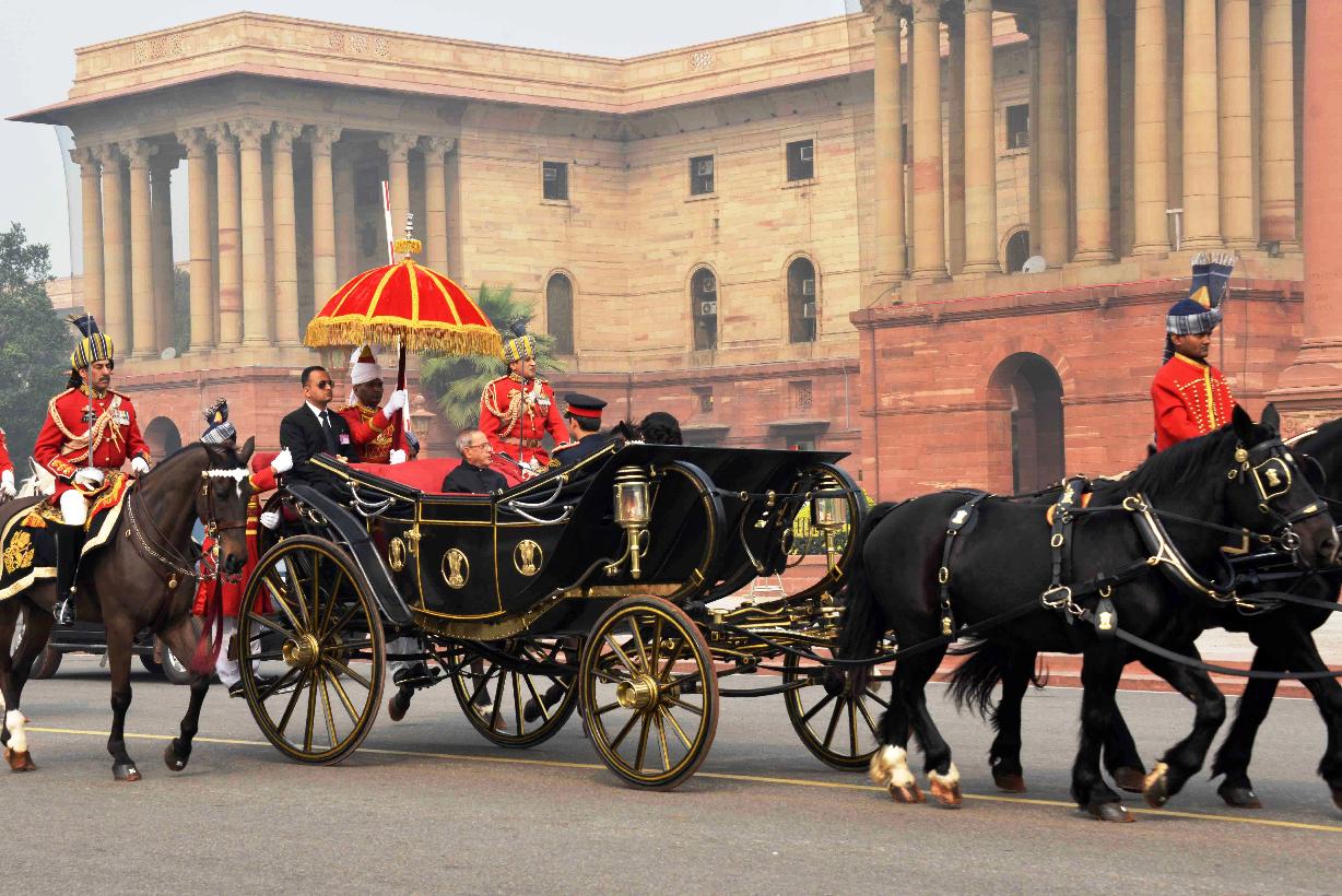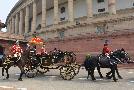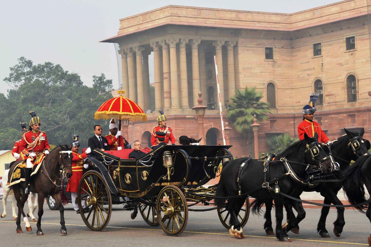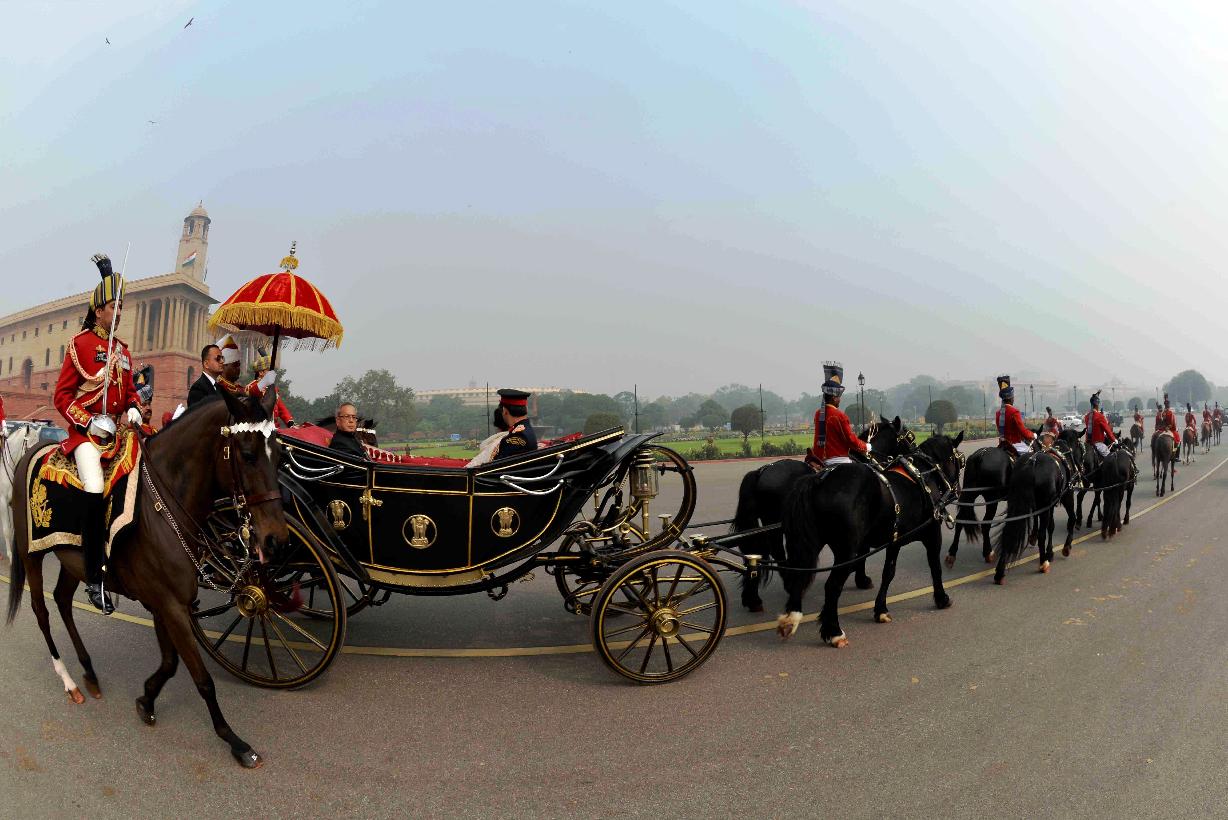 | Caption: | The President of India, Shri Pranab Mukherjee on the way to the Parliament House to address the members of both Houses of Parliament, at Vijay Chowk, in New Delhi on February 23, 2015. |