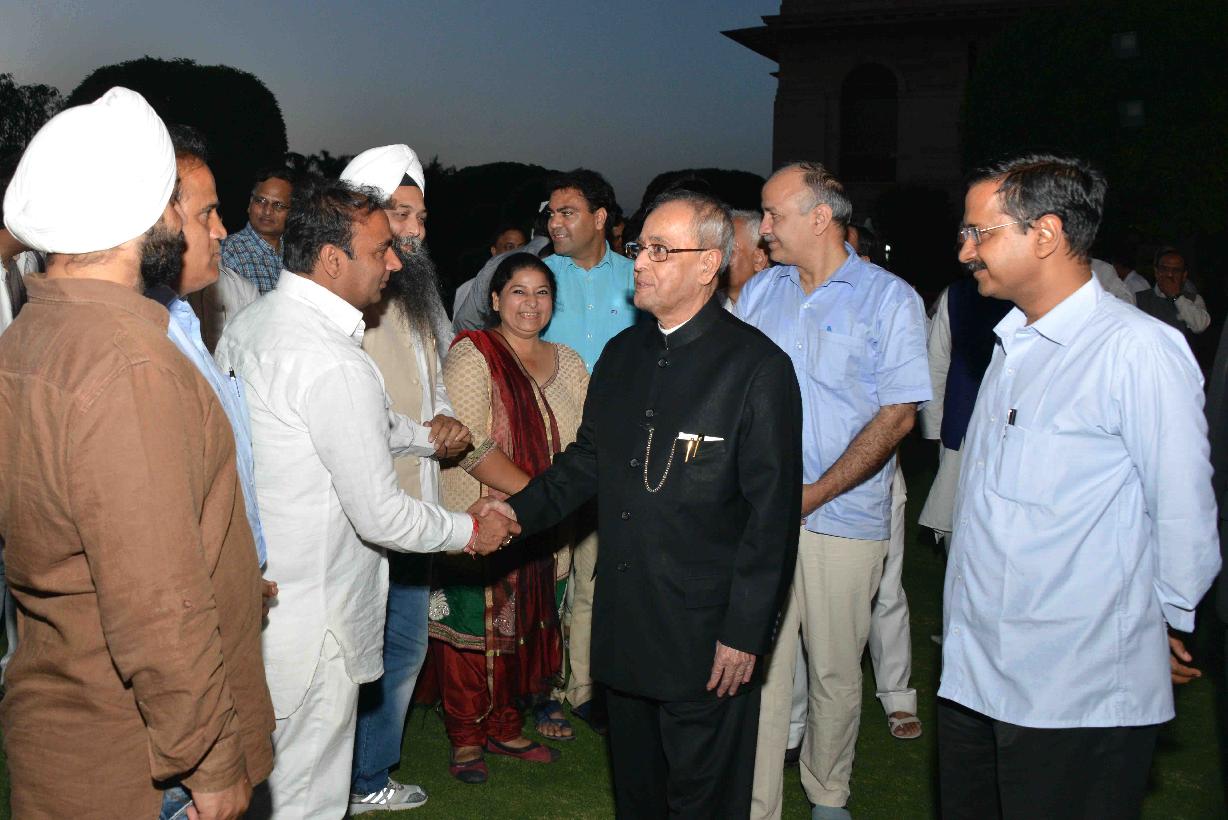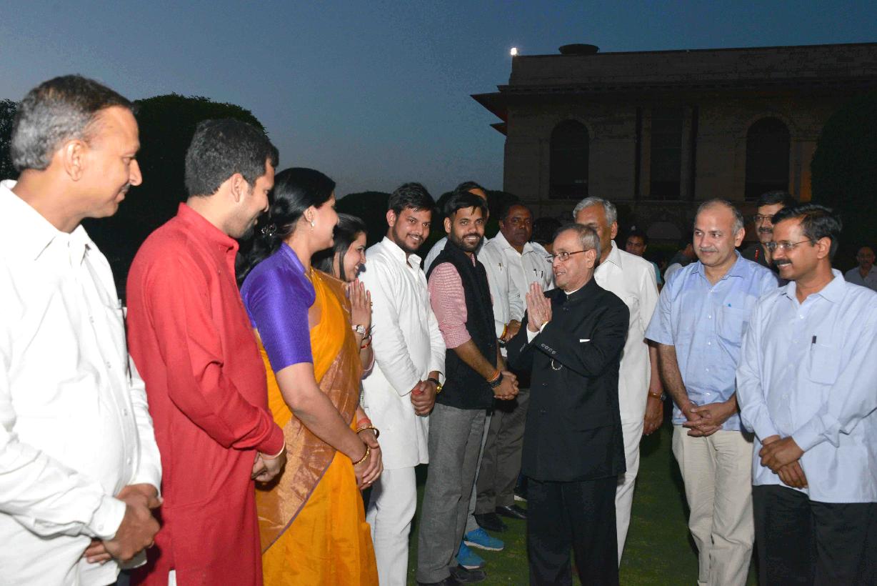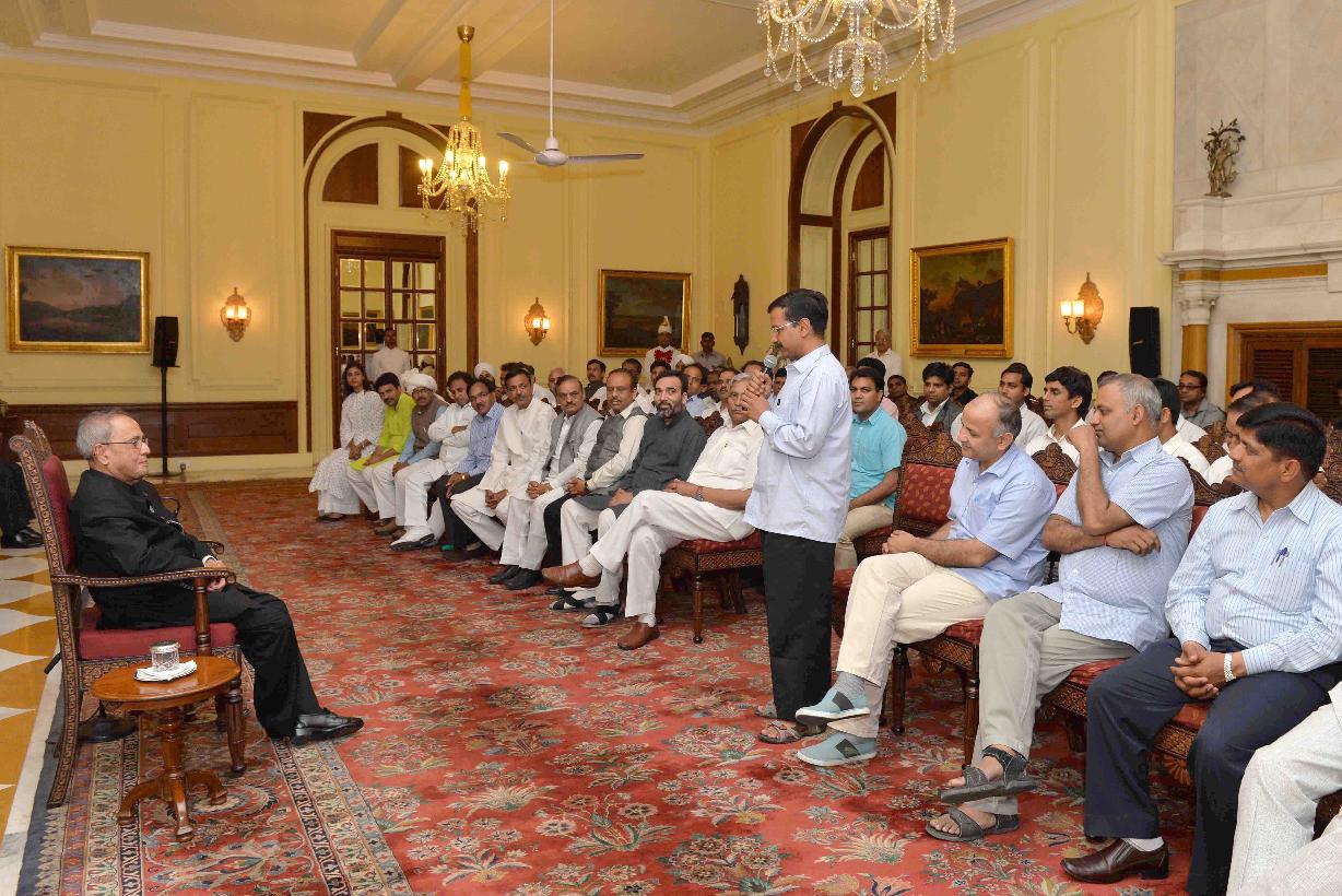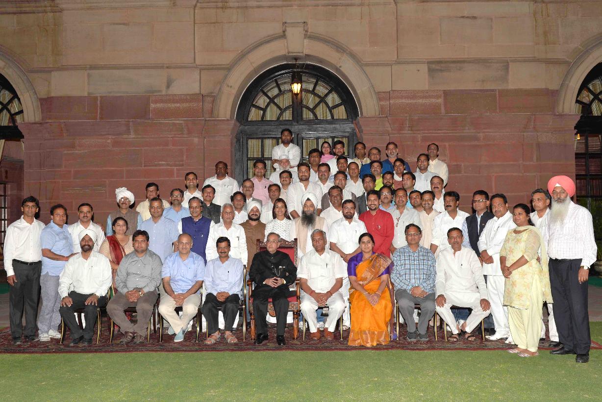 | Caption: | The President of India, Shri Pranab Mukherjee with the Chief Minister of Delhi, Shri Arvind Kejriwal, the Speaker, Delhi Legislative Assembly, Shri Ram Niwas Goel and the MLAs of 6th Legislative Assembly of Delhi, at Rashtrapati Bhavan, in New Delhi on March 27, 2015. |