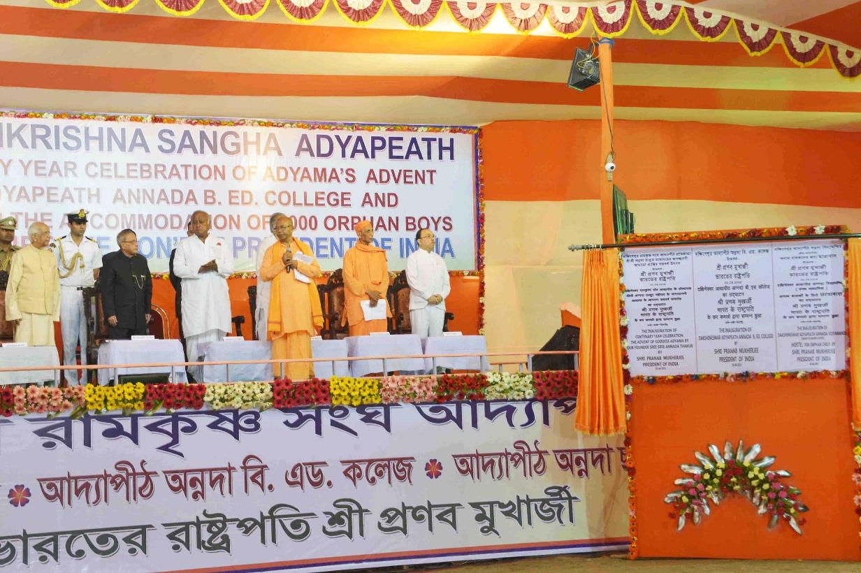 | Caption: | The President of India, Shri Pranab Mukherjee inaugurating the Centenary Year Celebrations of Adyama's Adment with opening of Annada B.Ed College and an Orphanage of Boys, at Dakshineswar Ramakrishna Sangha Adyapeath, Dakshineswar in West Bengal on April 02, 2015. |