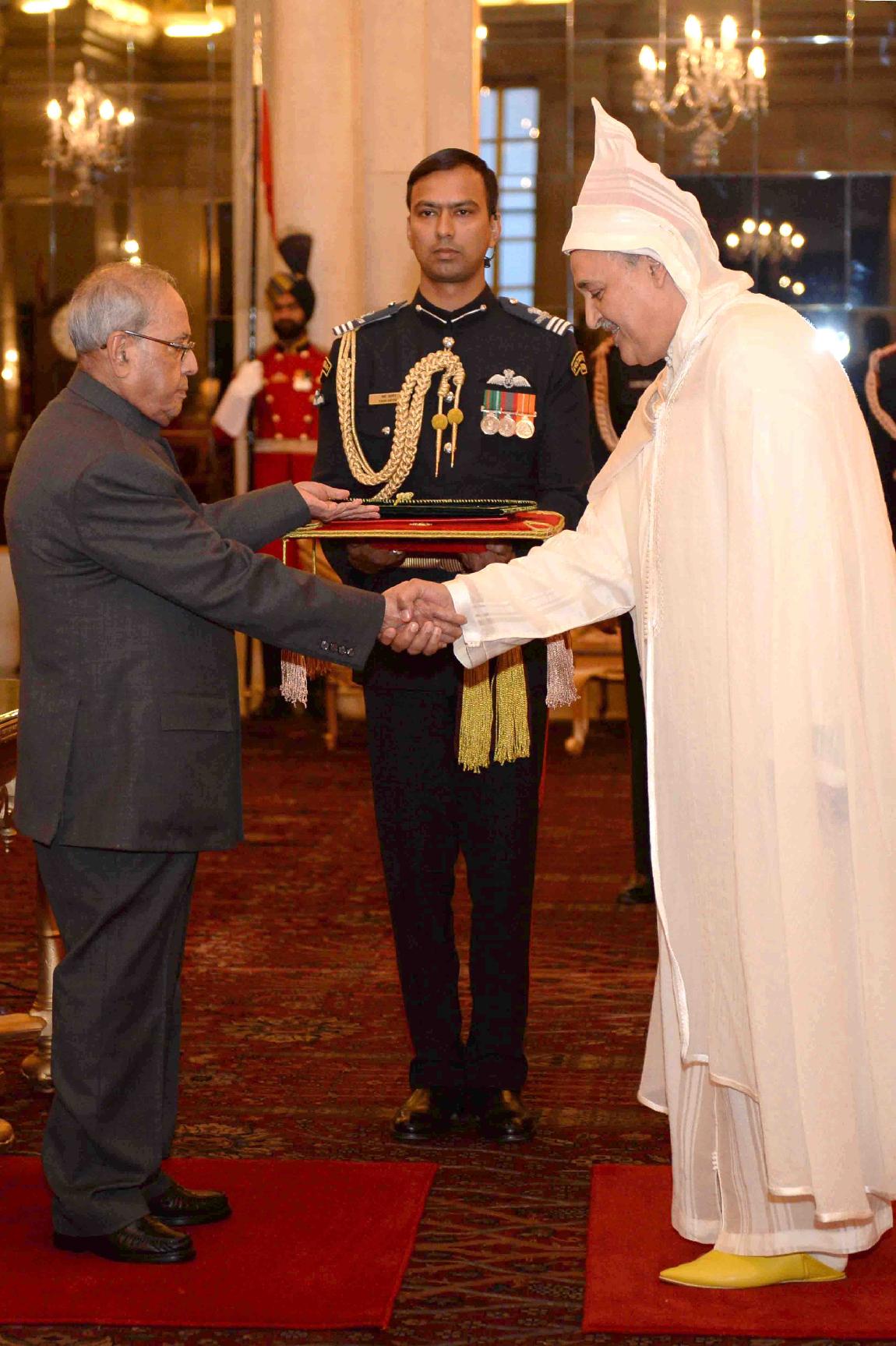 | Caption: | The Ambassador-designate of Morocco, H.E. Mr. Mohamed Maliki presenting his credentials to the President of India, Shri Pranab Mukherjee, at Rashtrapati Bhavan on February 15, 2017. |