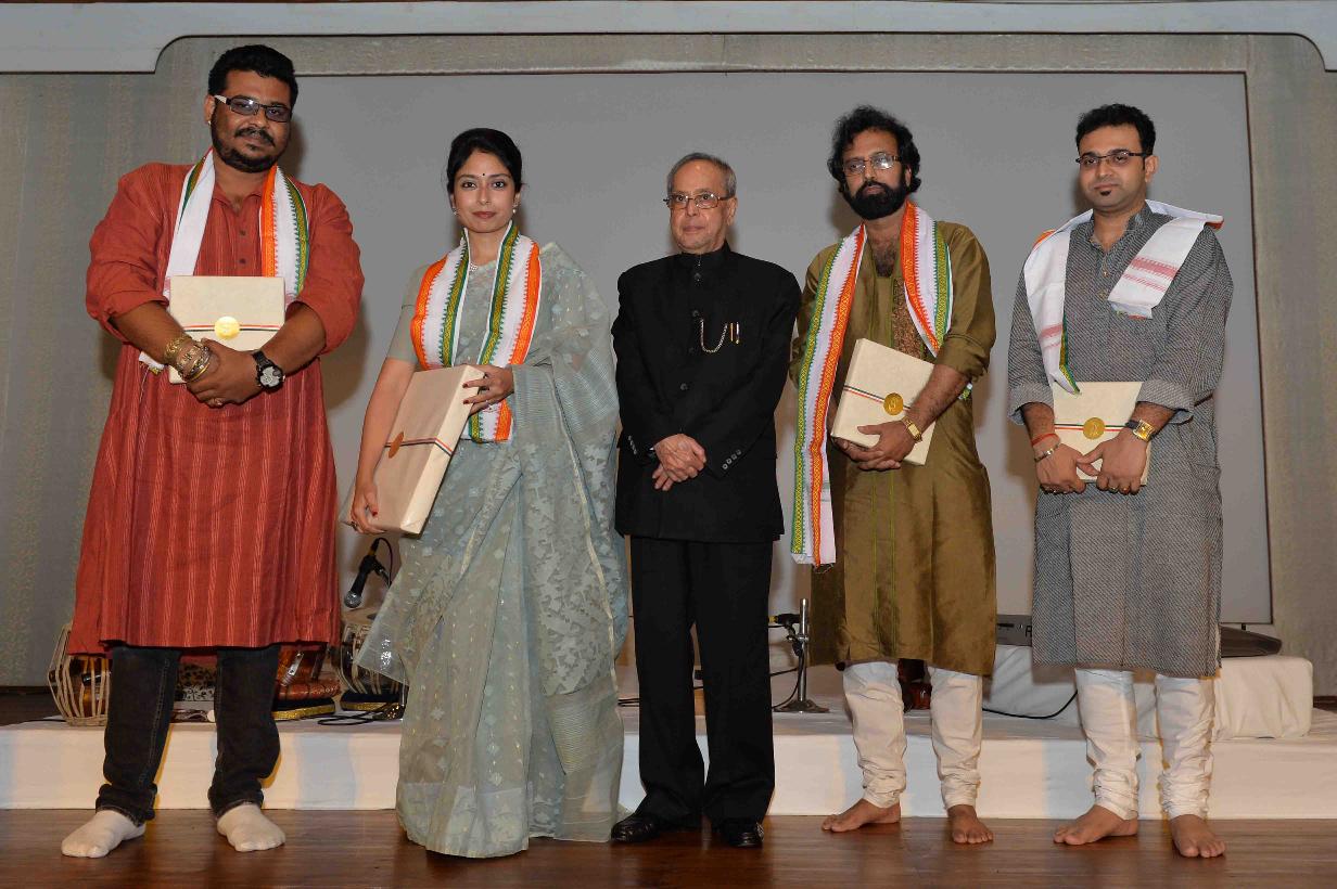 | Caption: | The President of India, Shri Pranab Mukherjee with the artists after witnessing a Rabindra Sangeet recital by Ms. Kamalini Mukherjee, at Rashtrapati Bhavan, in New Delhi on May 06, 2015. |