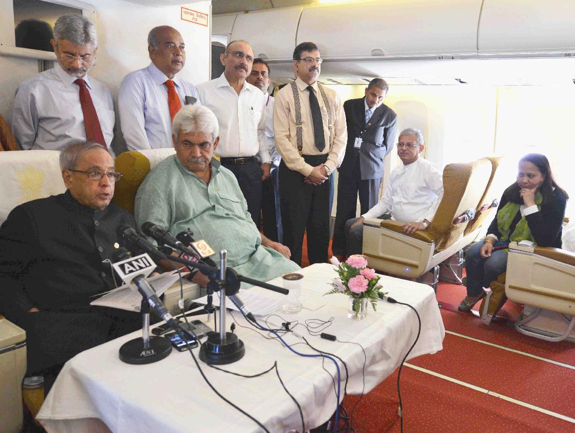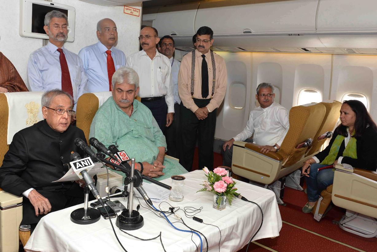 | Caption: | The President of India, Shri Pranab Mukherjee interacting with media delegation on board Air India special aircraft, on his way back to Delhi after his State Visit to Russia on May 11, 2015. |
