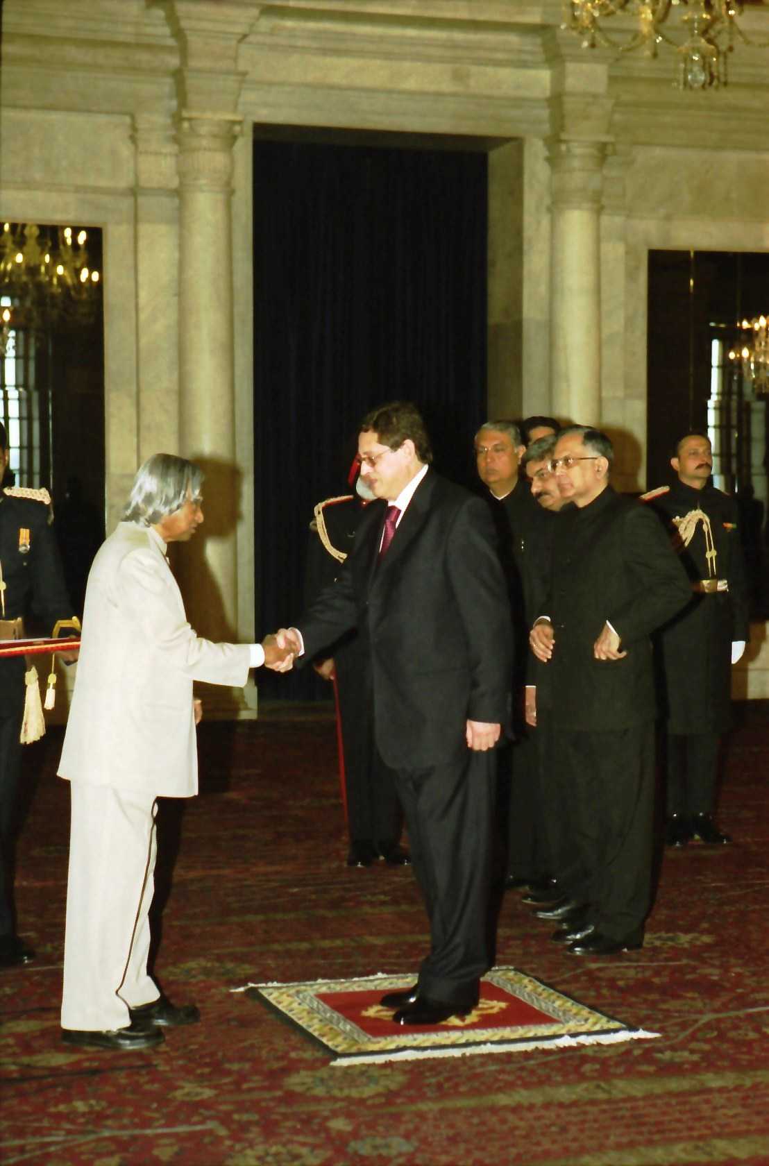 | Caption: | The Non-resident Ambassador-Designate of Republic of Albania with residence in Cairo to India, HE Viktor Karafil Kalemi presenting his credential to the President of India, Dr A P J Abdul Kalam at the Ashok Hall of at Rashtrapati Bhavan in New Delhi on Nov 24, 2003 |