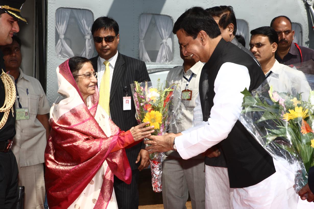 | Caption: | The President of India, Smt Pratibha Devisingh Patil being welcomed by the Chief Minister of Maharashtra, Shri Prithviraj Chavan at Nandurbar Helipad in Maharashtra on Feb 24, 2012 |