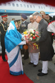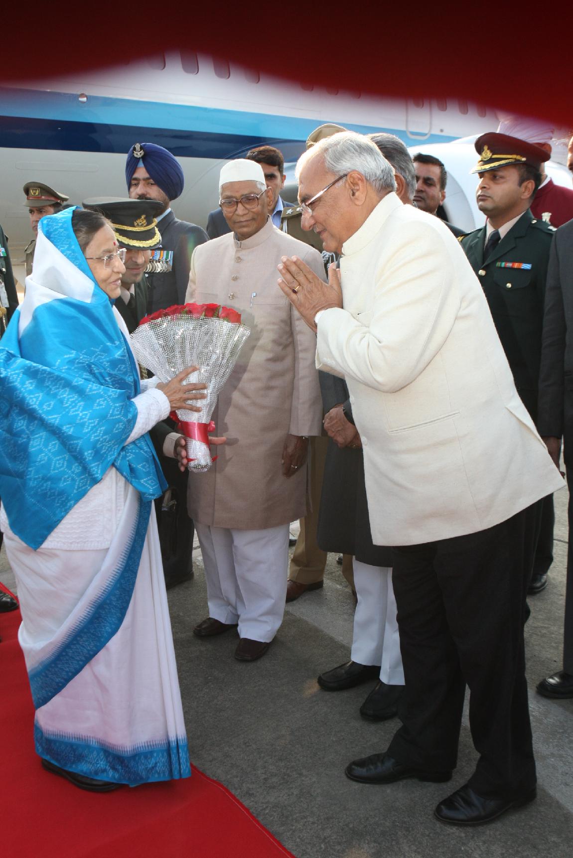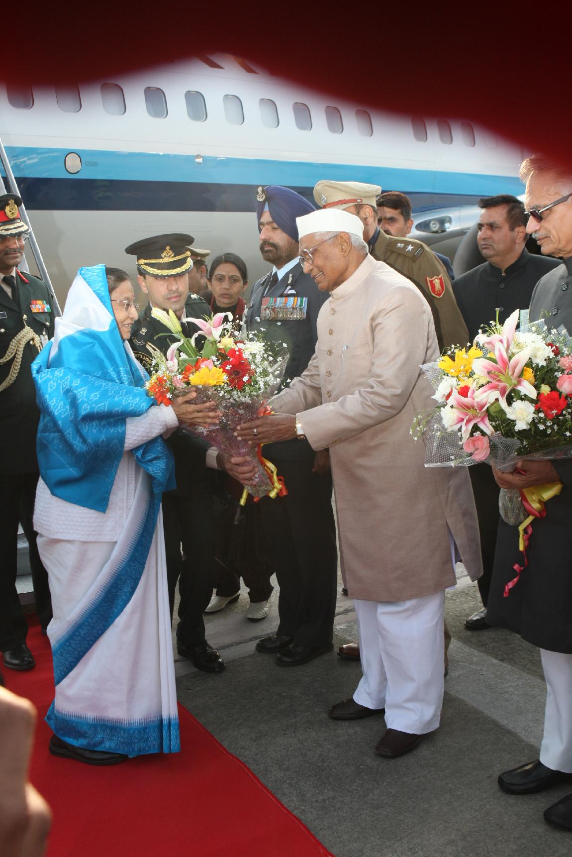 | Caption: | The President of India, Smt Pratibha Devisingh Patil being welcomed by the Governor of Punjab, Shri Shivraj Patil at Chandigarh Airport in Punjab on Feb 07, 2012 |