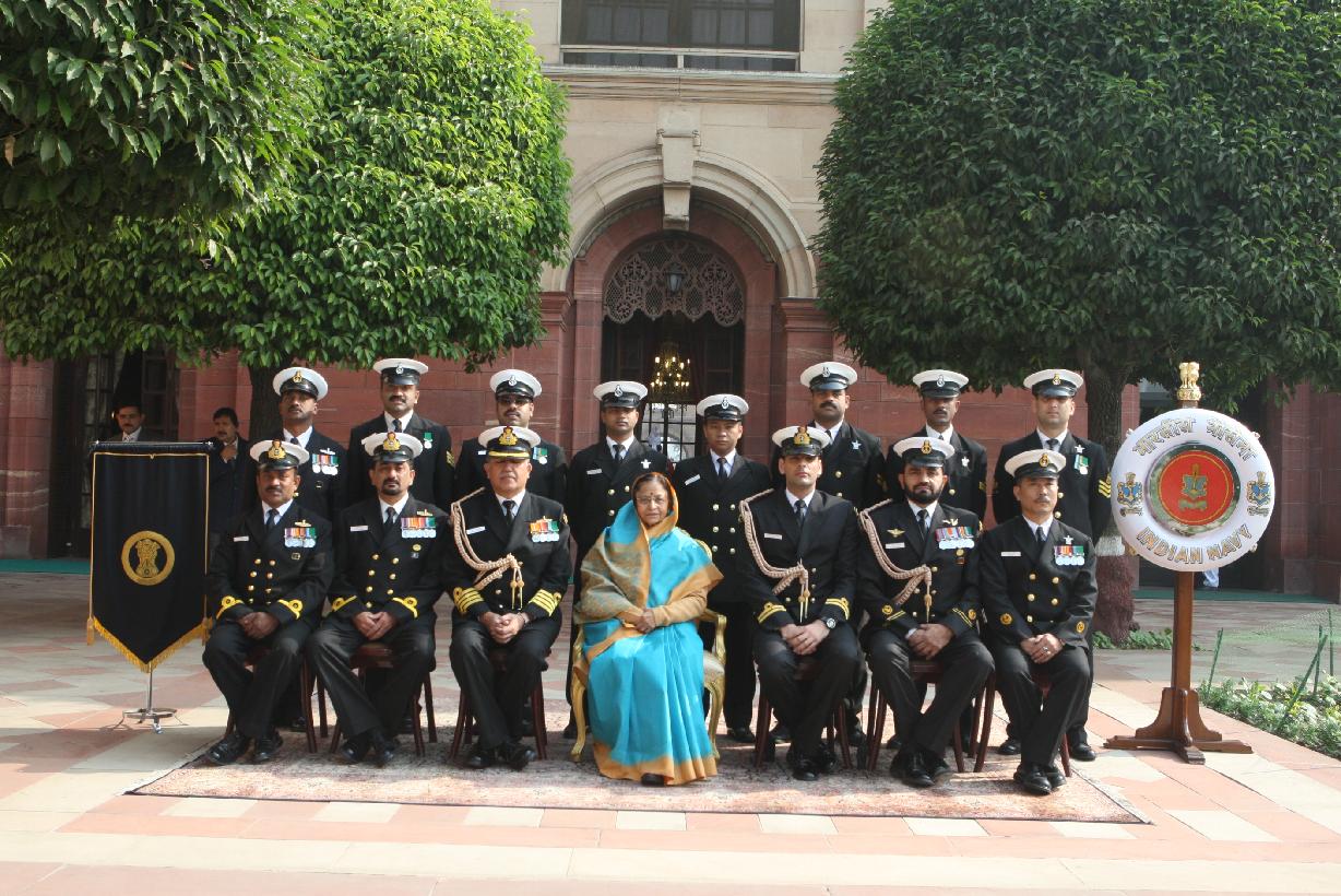 | Caption: | The President of India, Smt Pratibha Devisingh Patil posing for a Group Photograph with the Naval Officials at Rashtrapati Bhavan in New Delhi on Dec 07, 2011 |