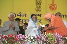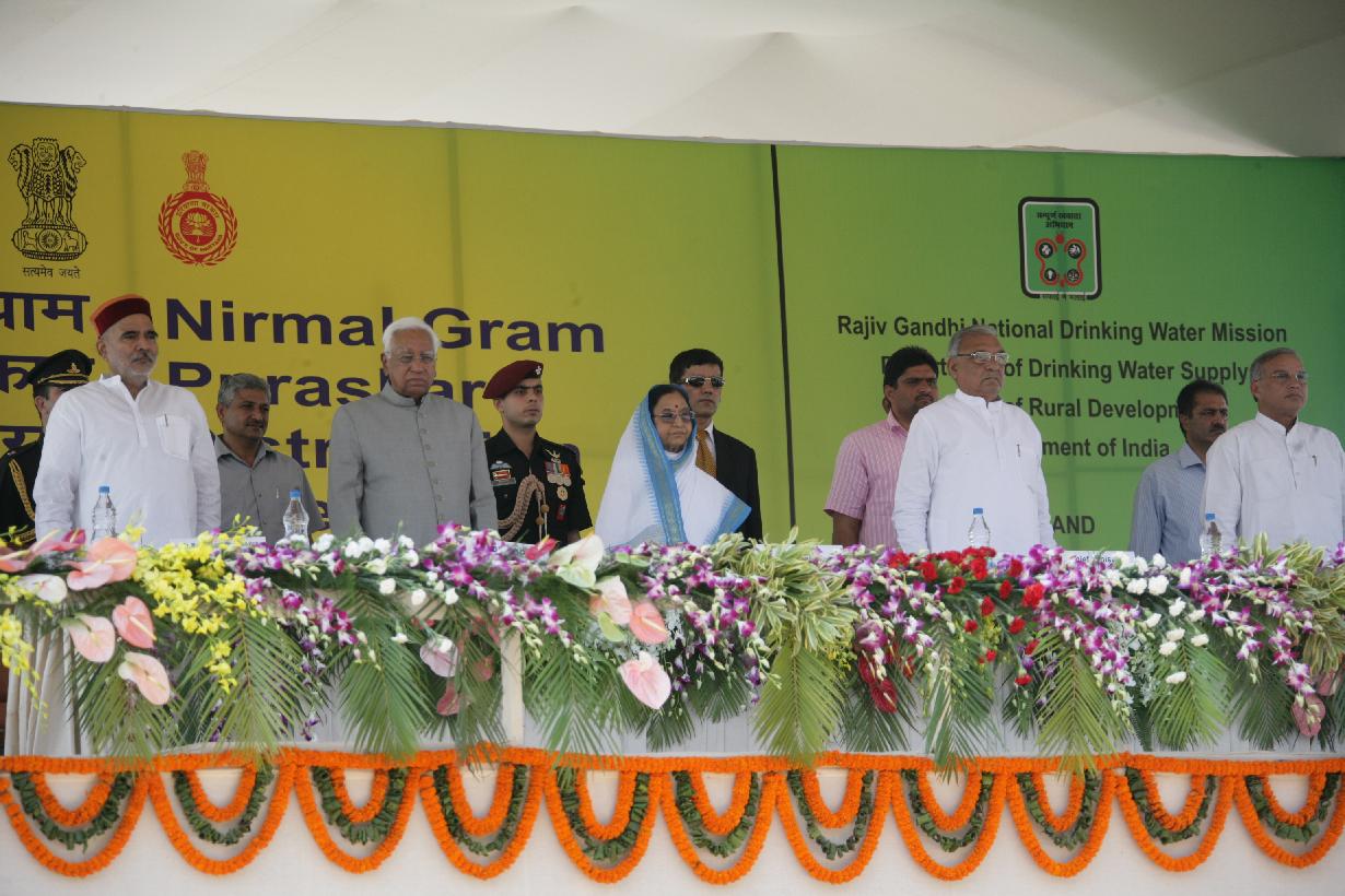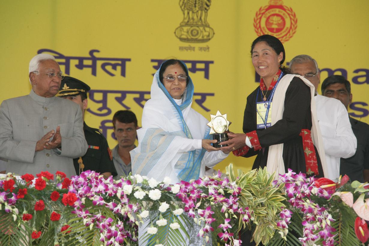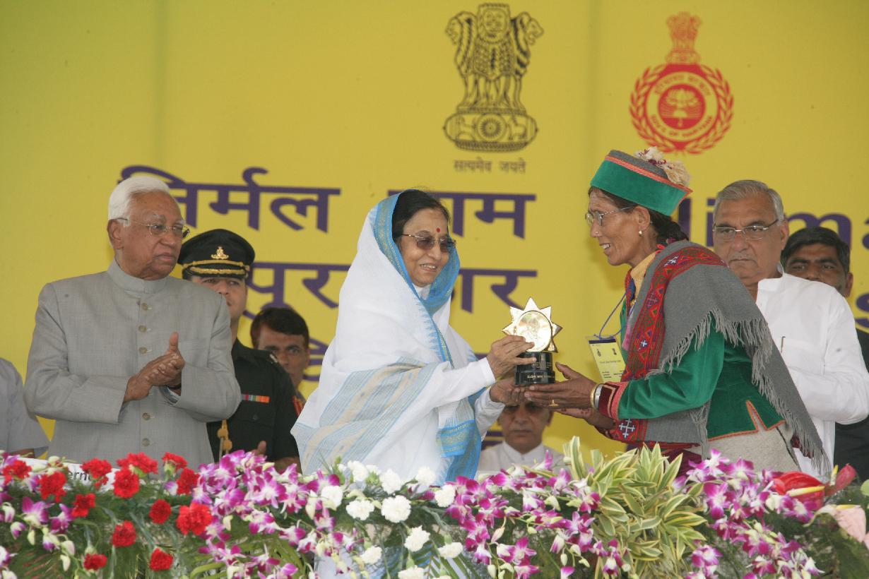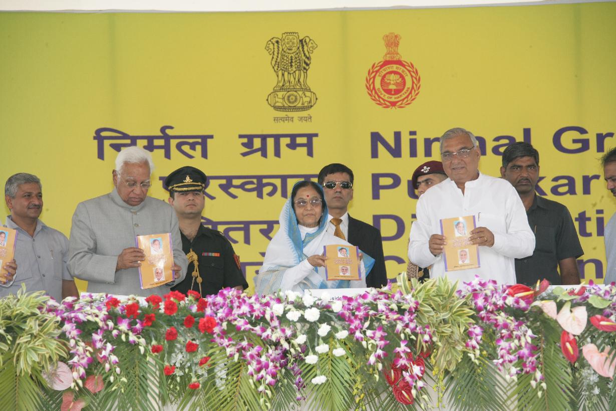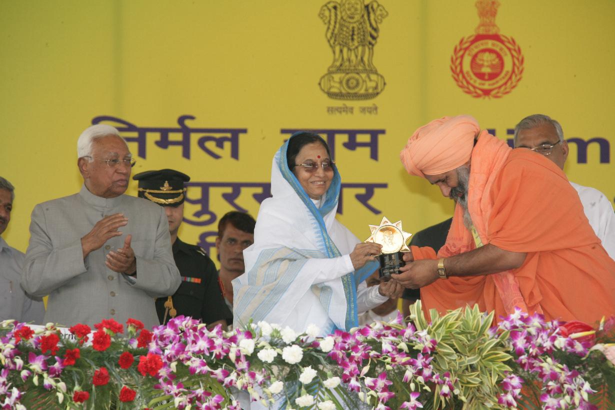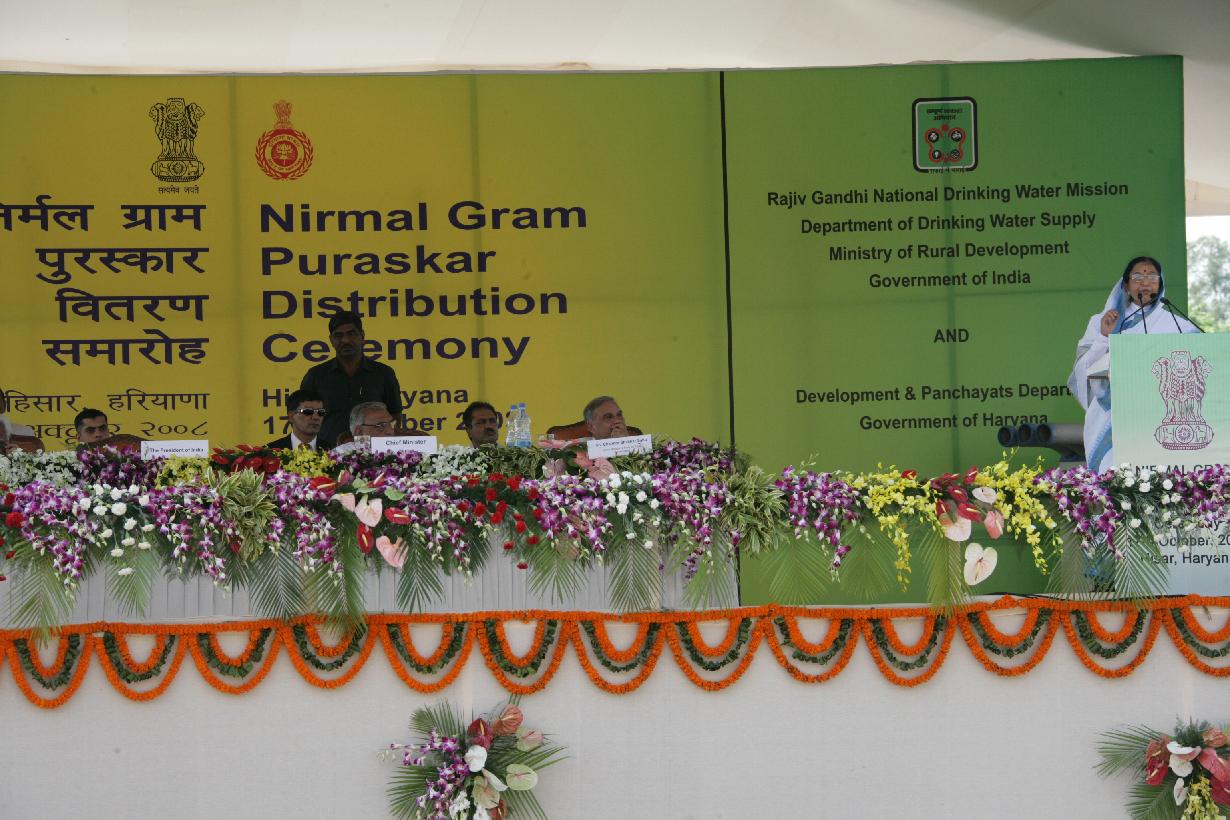 | Caption: | The President of India, Smt Pratibha Devisingh Patil presenting the Nirmal Gram Puraskar to one of the Award Winners at a Function at Hisar Airport in Haryana on Oct 17, 2008 |