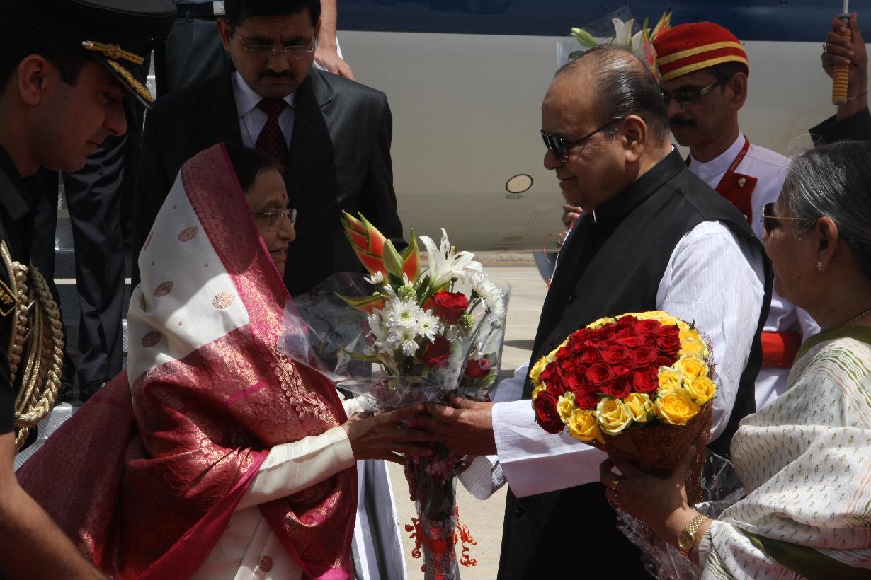 | Caption: | The President of India, Smt Pratibha Devisingh Patil being welcomed by the Governor of Maharashtra, Shri K Sankaranarayanan at Jalgaon Airport in Maharashtra on March 23, 2012 |