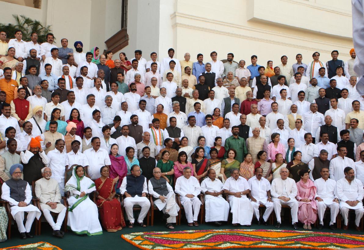 | Caption: | The President of India, Smt Pratibha Devisingh Patil posing for a Group Photograph with the Members of the Both House of the Parliament at Parliament House in New Delhi on 16 May, 2012 |