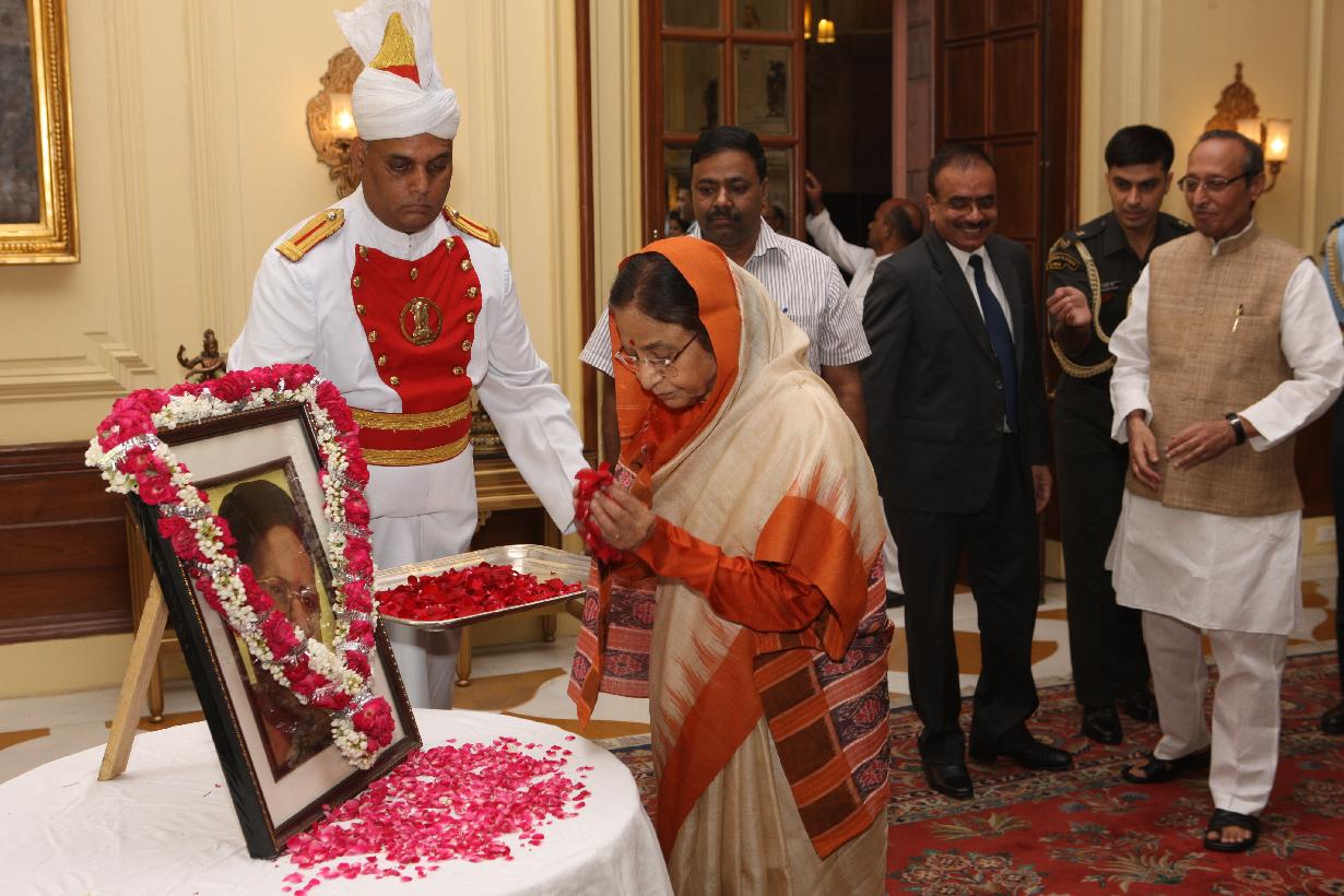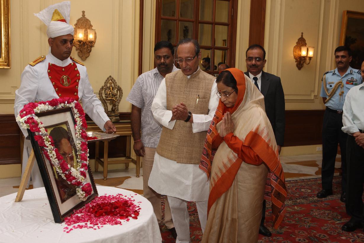 | Caption: | The President of India, Smt Pratibha Devisingh Patil paying floral tributes on the portrait of Kavivar Gopal Singh 'Nepali' on the occasion of his Birth Centenary Celebration at Rashtrapati Bhavan in New Delhi on 26 May, 2012 |