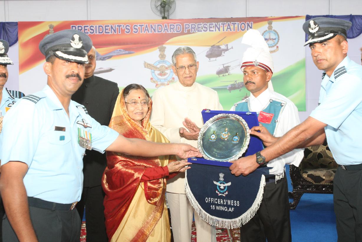 | Caption: | The President of India, Smt Pratibha Devisingh Patil receiving a Memento from Officer's Mess 15 Wing, AF at Bareilly in Uttar Pradesh on March 06, 2012 |