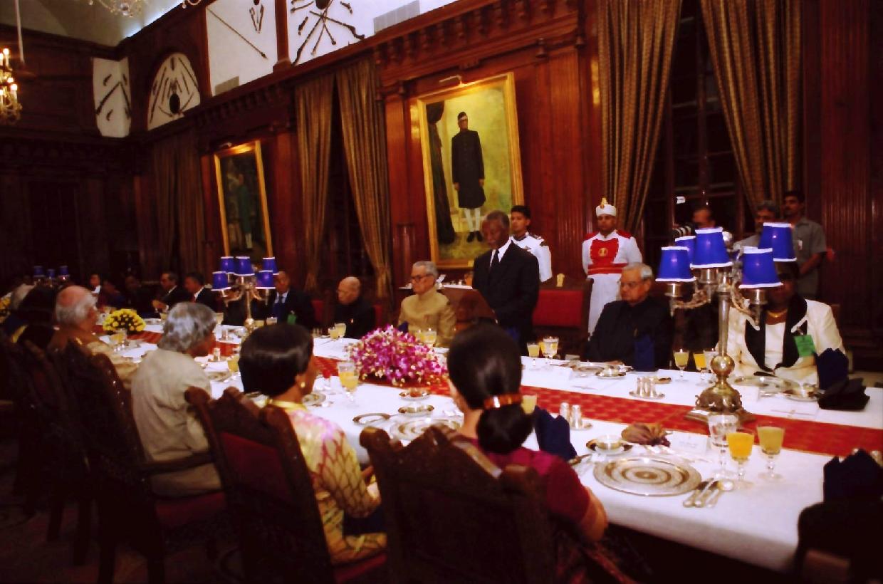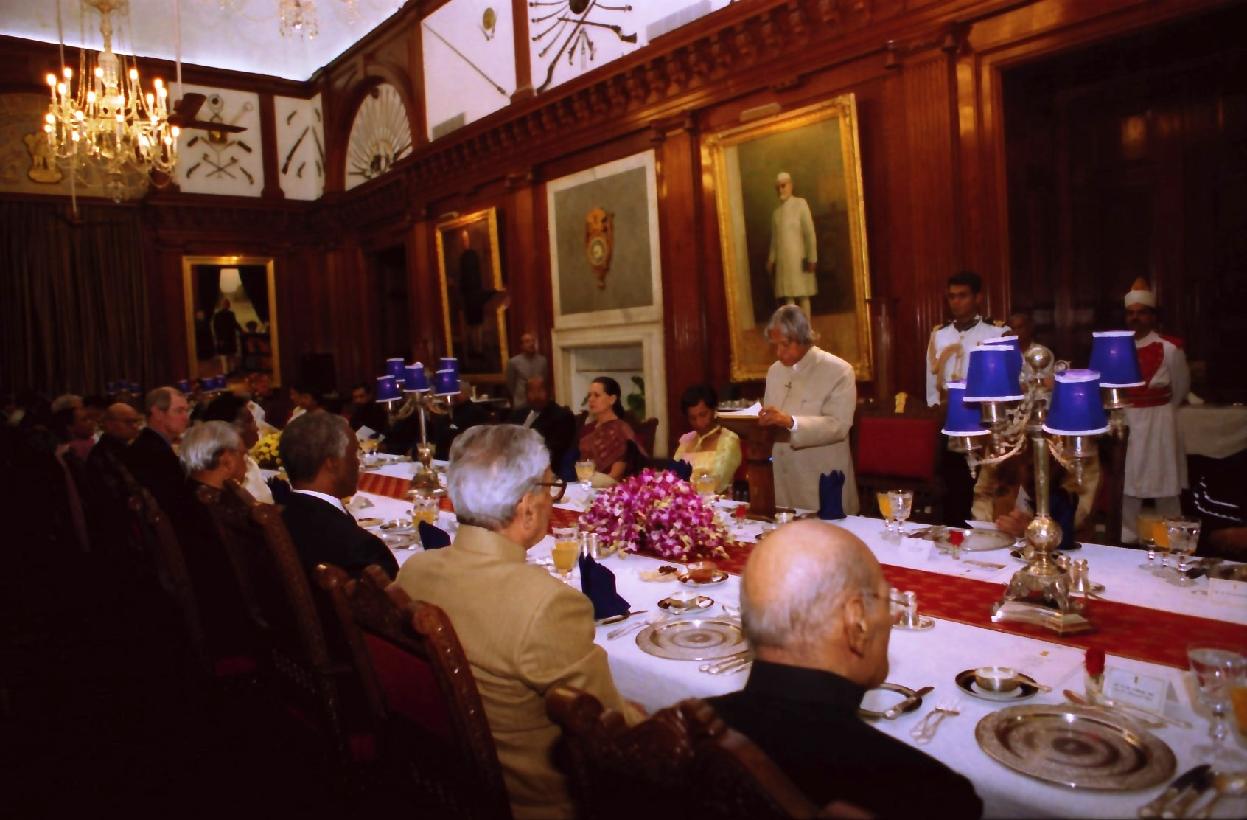 | Caption: | The President of India, Dr A P J Abdul Kalam at the Banquet Hosted in Honour of the Distinguished Guests of the President of the Republic of South Africa, His Excellency Mr T M Mbeki and Mrs Zanele Mbeki at the Banquet Hall of Rashtrapati Bhavan in New Delhi on Oct 16, 2003 |