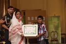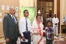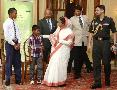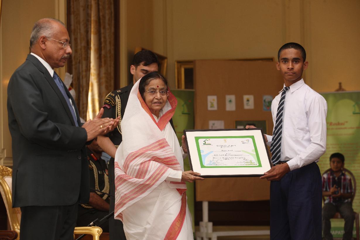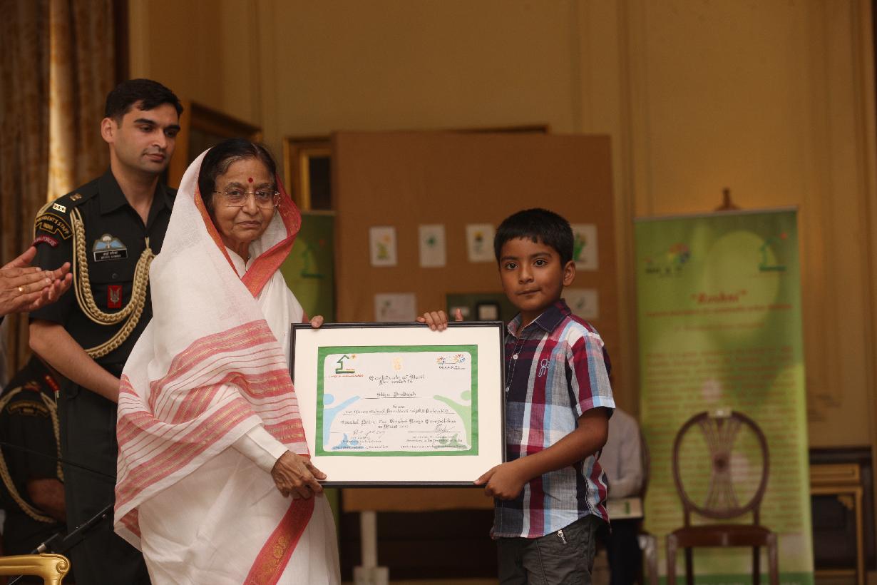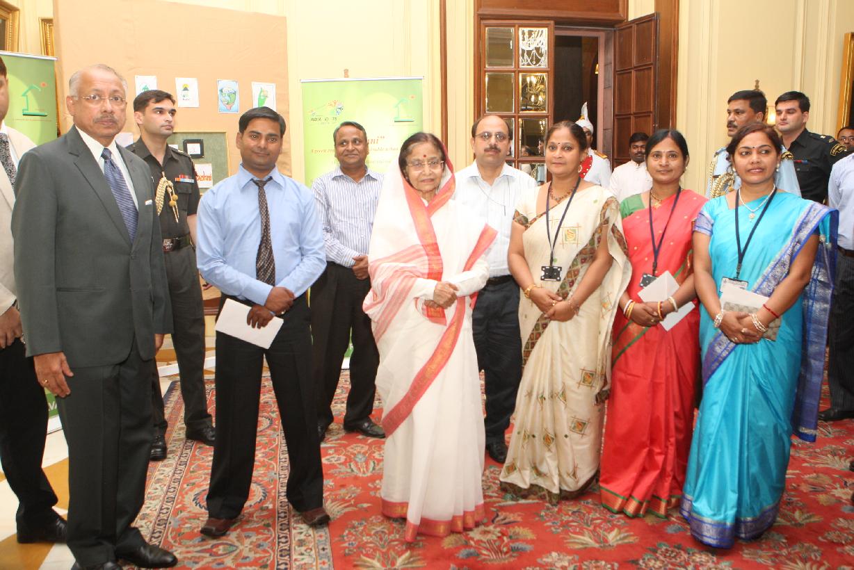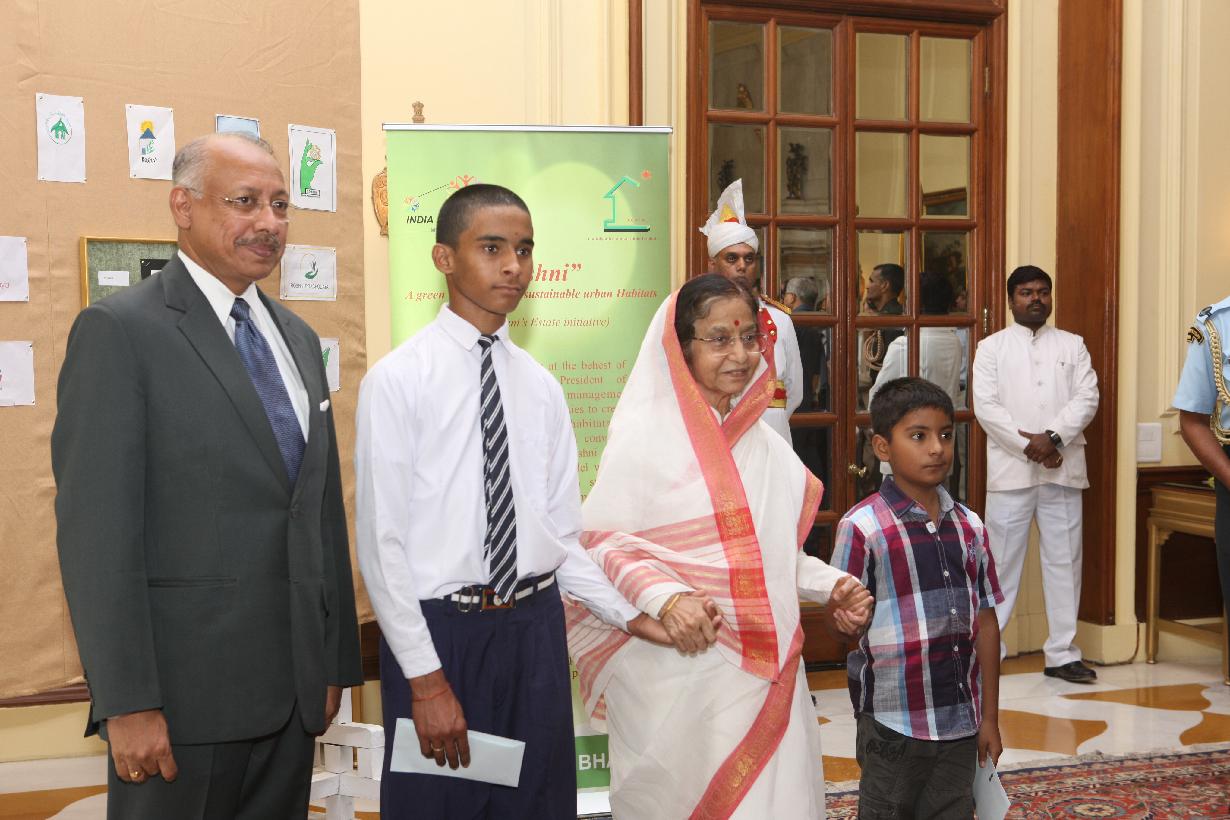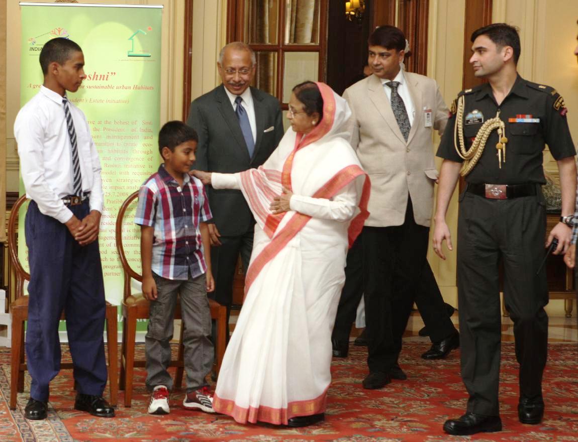 | Caption: | The President of India, Smt Pratibha Devisingh Patil with the winner of the 'Roshni' Logo Competition, Master Robin Singh (to the left) and the winner of the Encouragment Prize, Master Vibhu Prakash (to the right) at Rashtrapati Bhavan in New Delhi on June 05, 2012 |