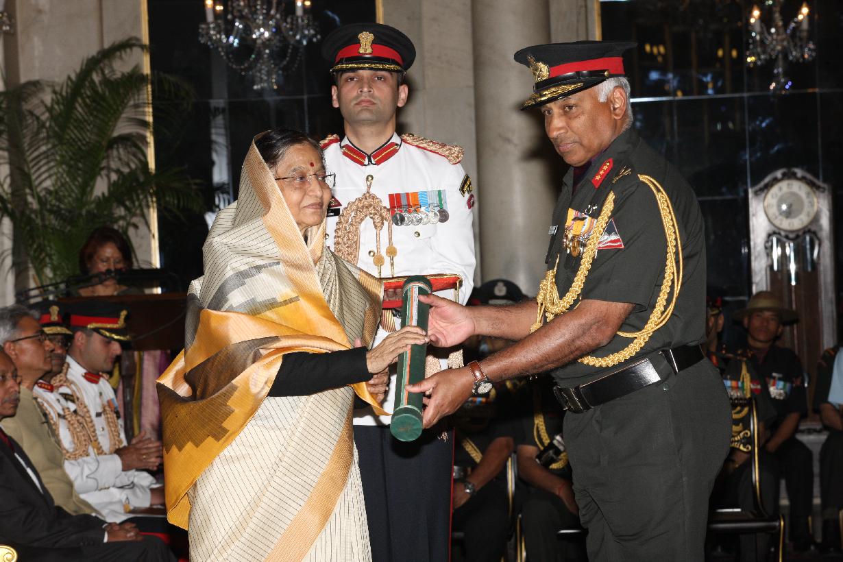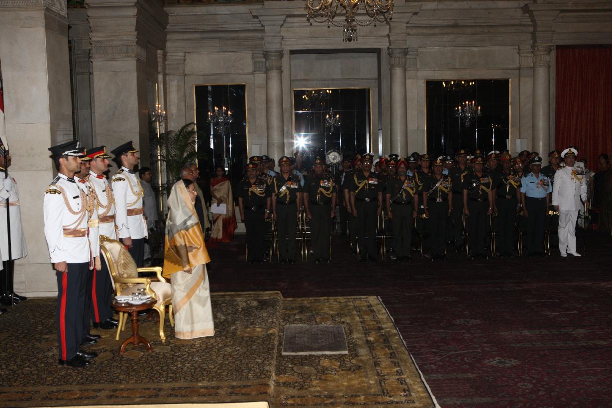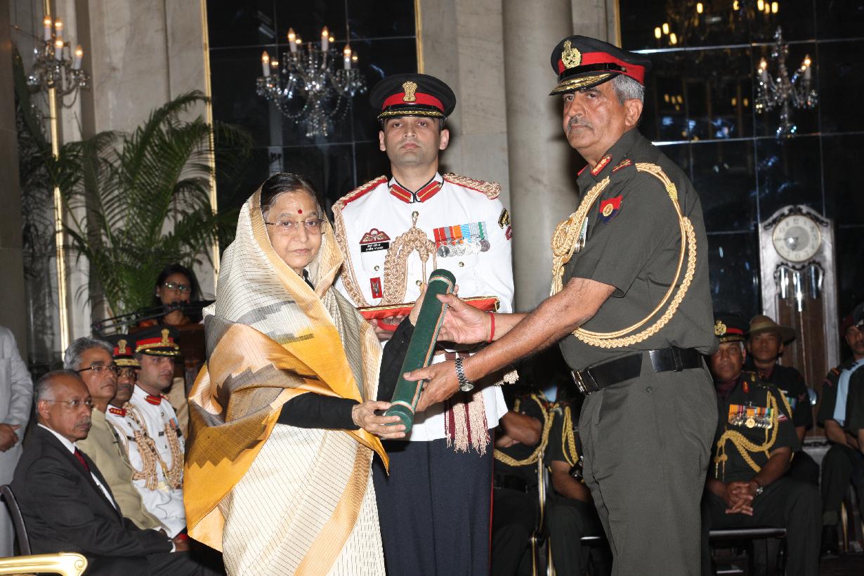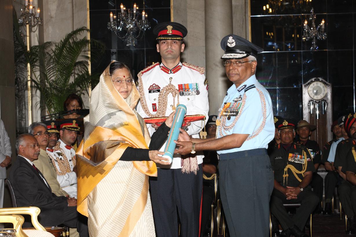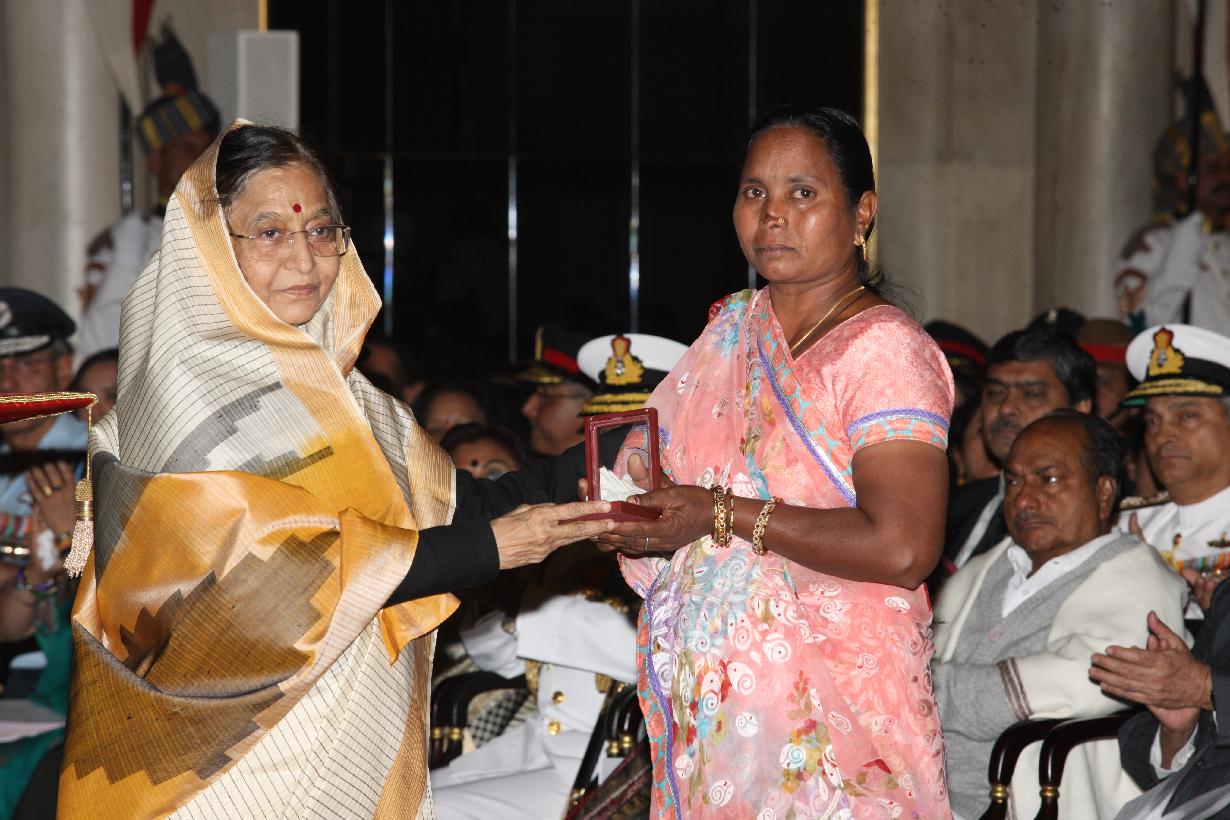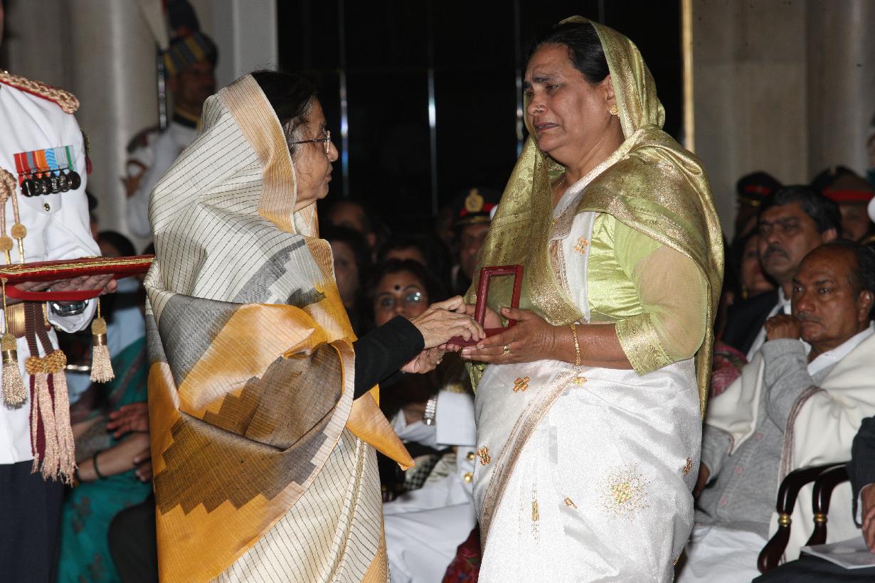 | Caption: | The President of India, Smt Pratibha Devisingh Patil presenting a Defence Investiture award posthumously to a Next of Kin at the Ashoka Hall of Rashtrapati Bhavan on March 14, 2012 |