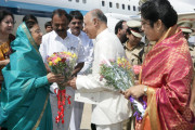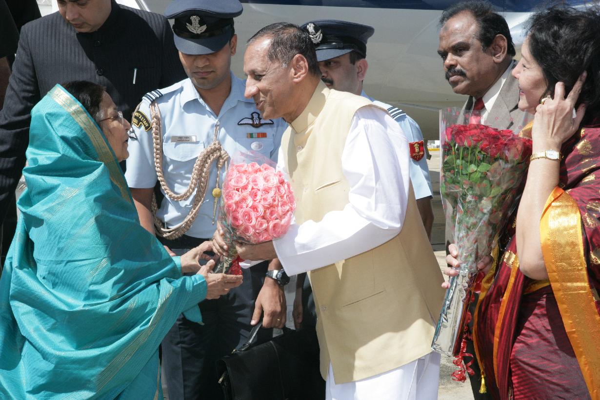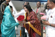 | Caption: | The President of India, Smt Pratibha Devisingh Patil being welcomed by the Governor of Andhra Pradesh, Shri E S L Narasimhan at Puttaparthi Airport in Andhra Pradesh on Nov 19, 2010 |