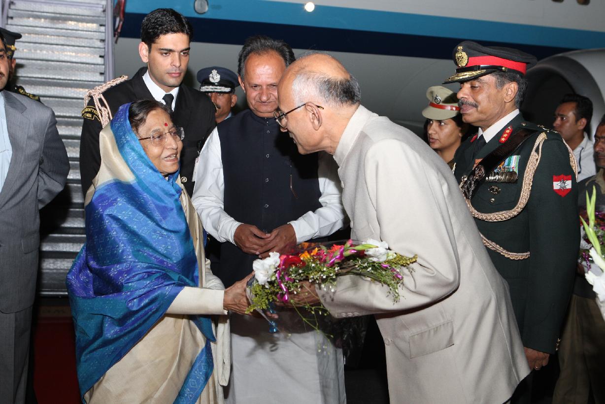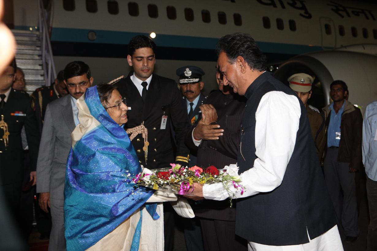 | Caption: | The President of India, Smt Pratibha Devisingh Patil being welcomed by the Chief Minister of Rajasthan, Shri Ashok Gehlot at Jodhpur Airport in Rajasthan on Dec 04, 2011 |