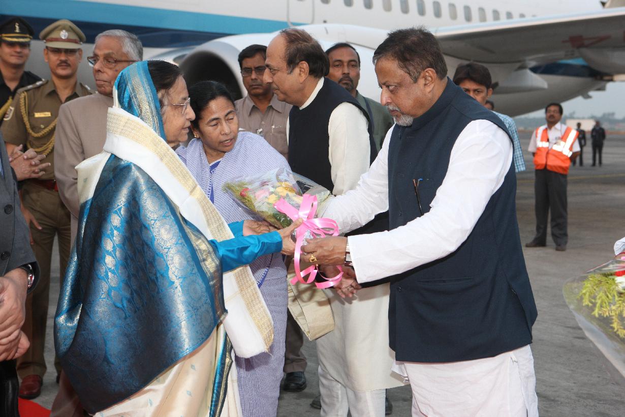 | Caption: | The President of India, Smt Pratibha Patil being welcomed by the Governor of West Bengal, Shri M K Narayanan and the Chief Minister of West Bengal, Mamata Banerjee at Kolkata Airport in West Bengal on Nov 28, 2011 |