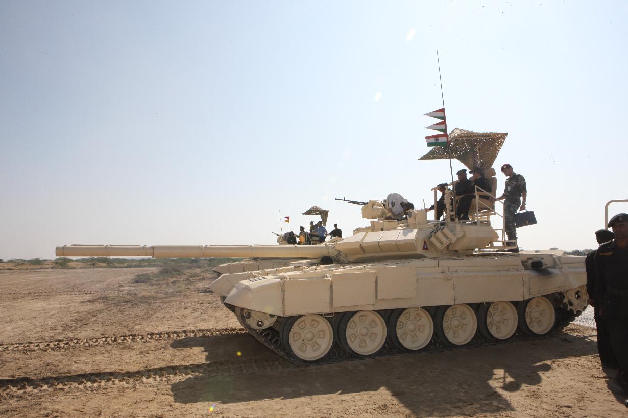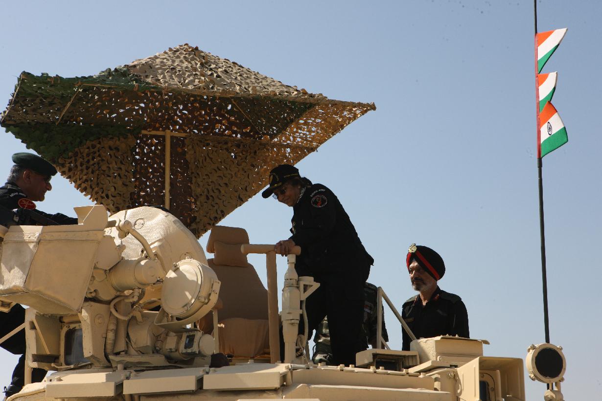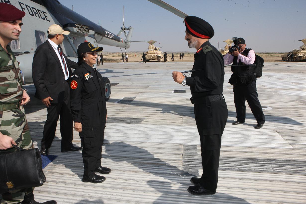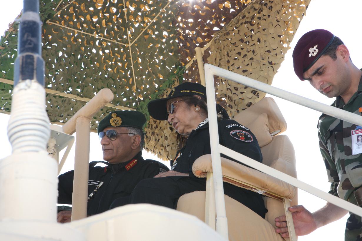 | Caption: | The President of India, Smt Pratibha Devisingh Patil during the climb on board at the T-90 Tank of the Indian Army during Exercise Sudarshan Shakti near Jodhpur at Pachpadra in Rajasthan on Dec 05, 2011 |
