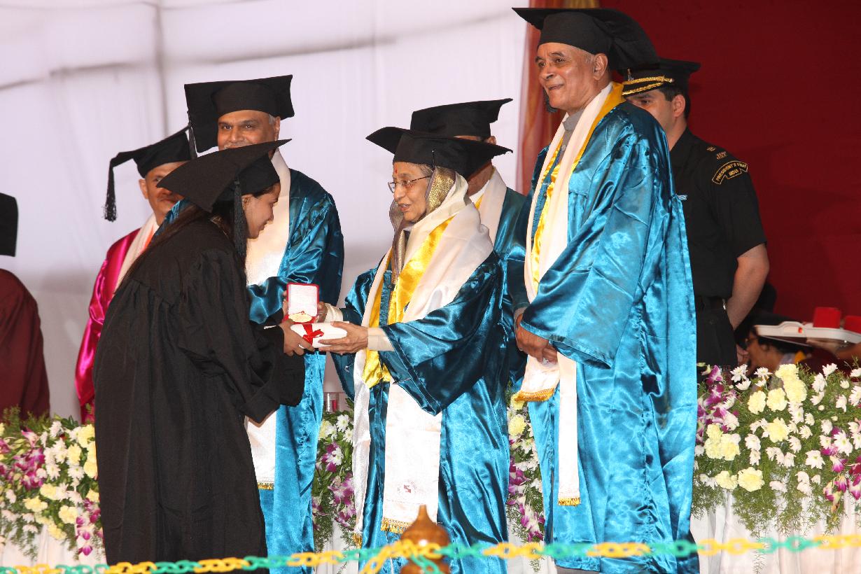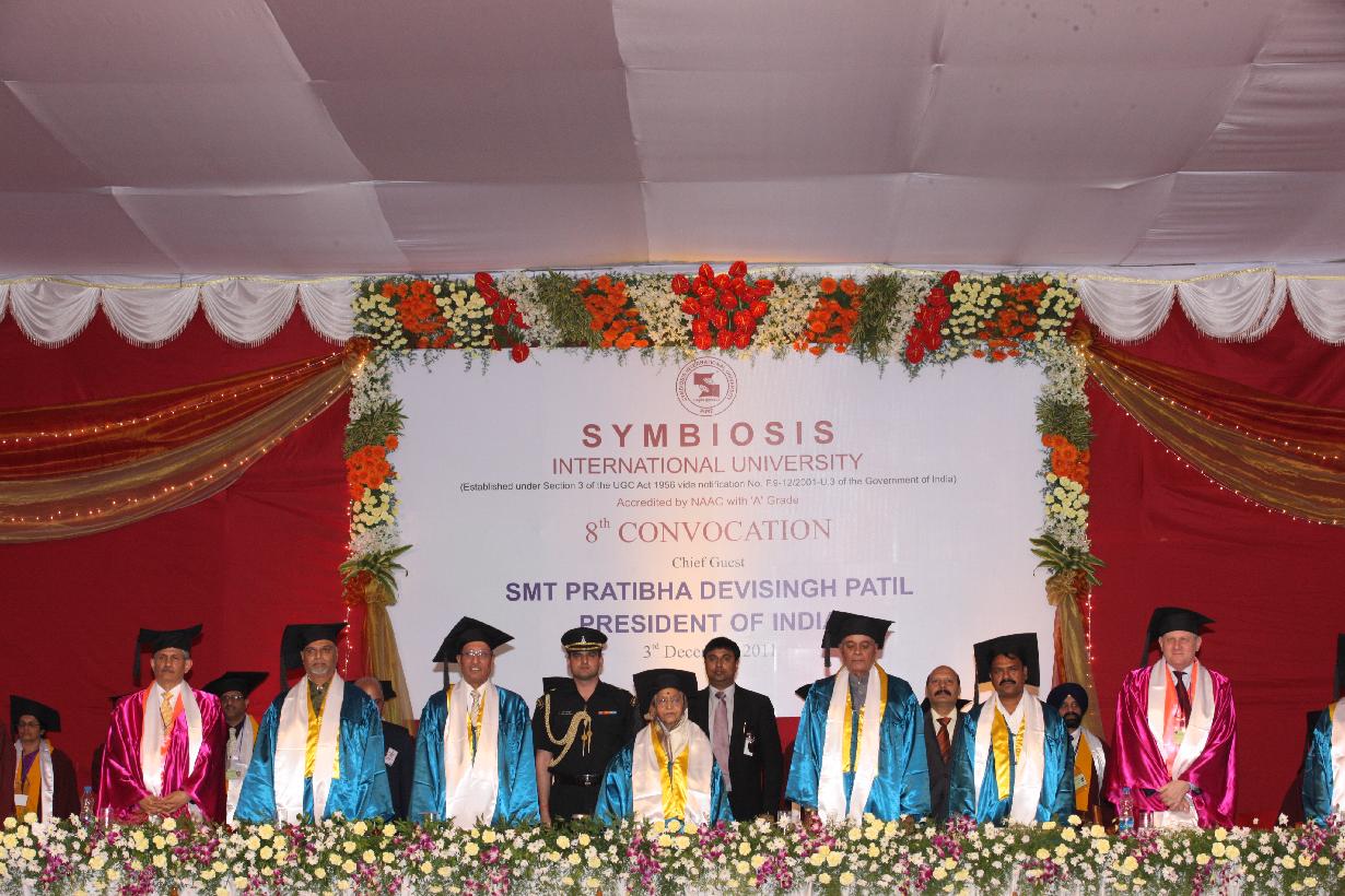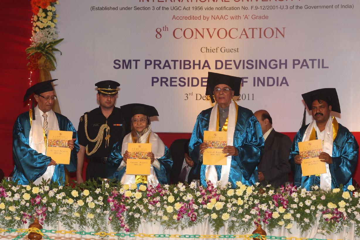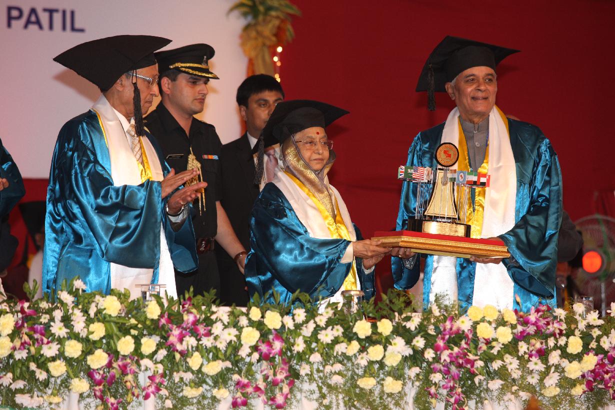 | Caption: | The President of India, Smt Pratibha Devisingh Patil during the 8th Convocation of the University and receiving the Flag of the United Nations from the Chancellor of the Symbiosis International University, Dr S B Mujumdar at Pune in Maharashtra on Dec 03, 2011 |