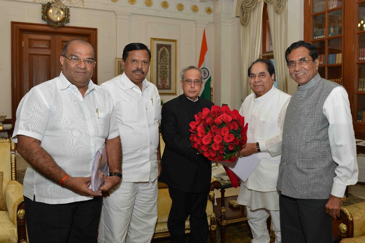 | Caption: | The President of India, Shri Pranab Mukherjee meeting with the former Governor of Bihar & Tripura, Dr. D.Y. Patil alongwith Shri Prakash Balkrishan Yelgulwar, General Secretary, Shri Sudhir S. Kharatmal, Secretary, Maharashtra Pradesh Congress Committee and Shri Subhash Chavan, Ex-MLC, Maharashtra, at Rashtrapati Bhavan, in New Delhi on August 03, 2015. |