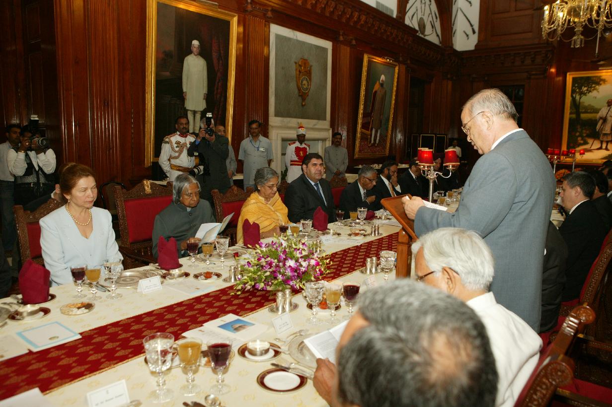 | Caption: | The President of India, Dr A P J Abdul Kalam at the Banquet Hosted in Honour of the President of the Republic of Uzbekistan, HE Mr Islam A Karimov and his wife Mrs Tatyana A Karimov at the Banquet Hall of Rashtrapati Bhavan in New Delhi on April 05, 2005 |