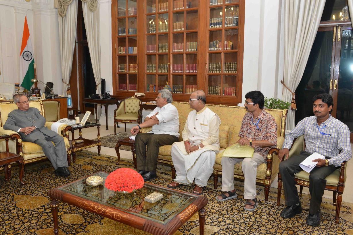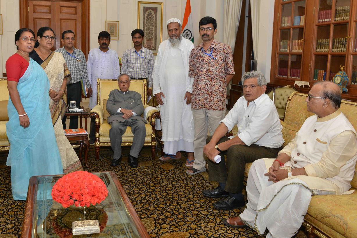 | Caption: | The President of India, Shri Pranab Mukherjee meeting with Shri Pradip Bhattacharya, MP (RS), Shri Sitaram Yechury, MP (RS), Prof. Ambikesh Mahapatra and others from West Bengal, at Rashtrapati Bhavan, in New Delhi on August 10, 2015. |