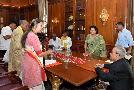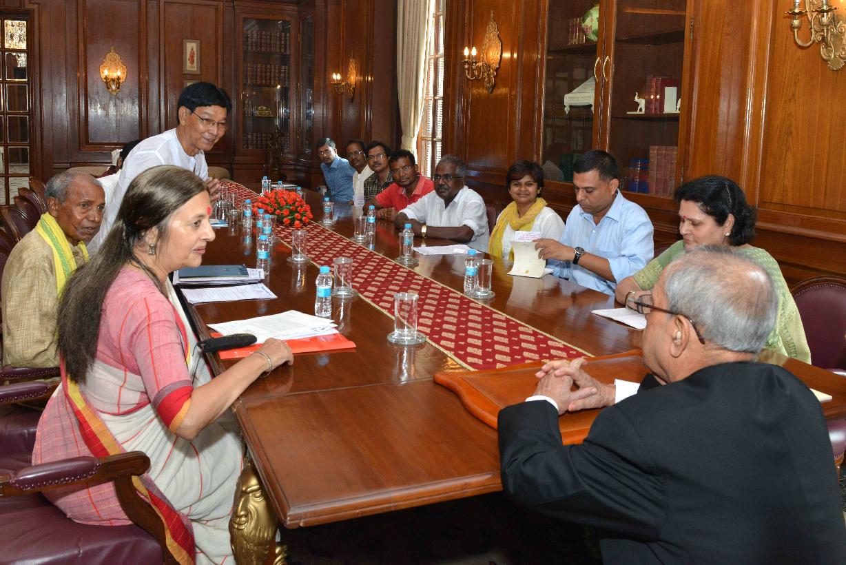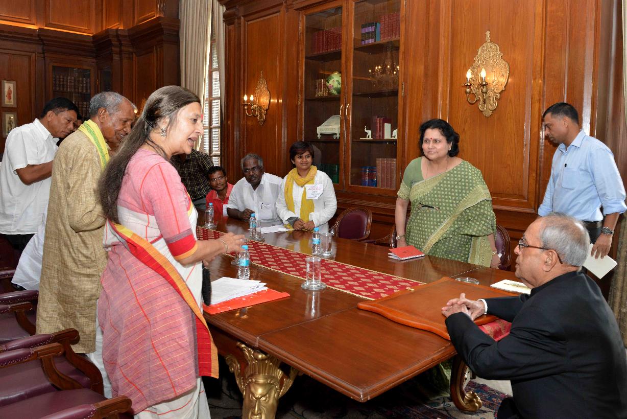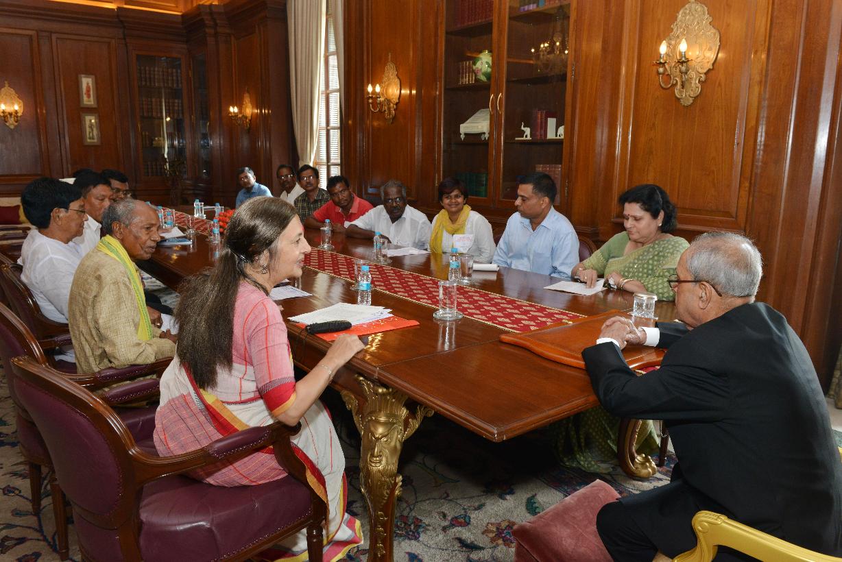 | Caption: | The President of India, Shri Pranab Mukherjee meeting with Smt. Brinda Karat, Member, Polit Bureau, CPI (M) alongwith a delegation of adivasis from different states, at Rashtrapati Bhavan, in New Delhi on August 05, 2015. |