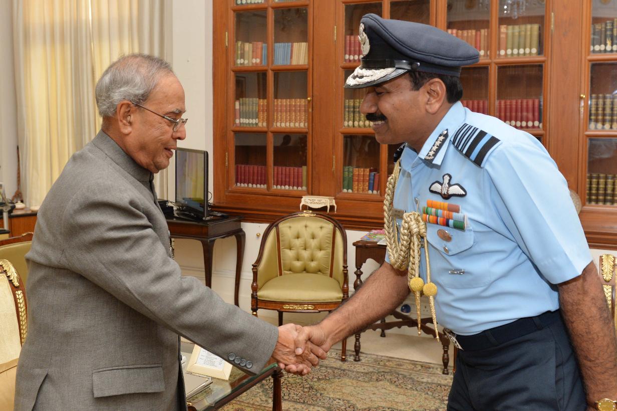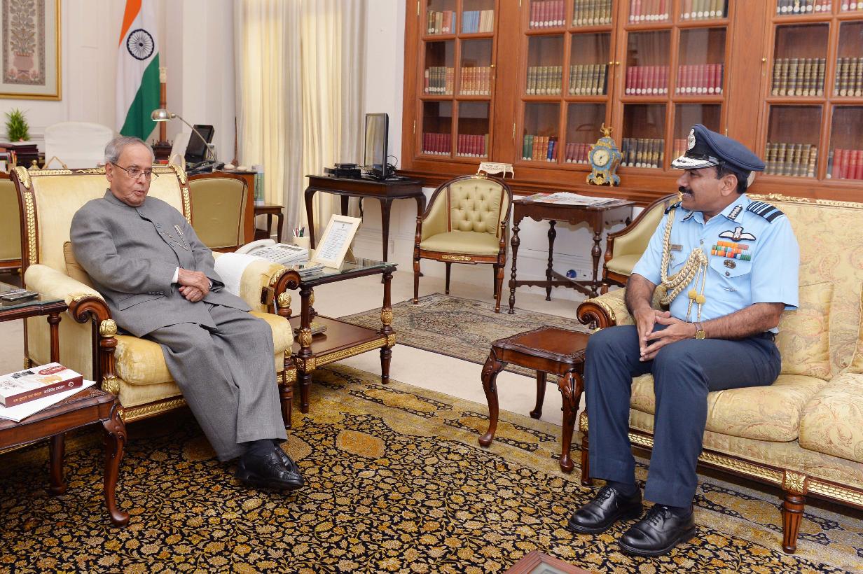 | Caption: | The President of India, Shri Pranab Mukherjee meeting with the Chief of Air Staff, Air Chief Marshal Arup Raha, at Rashtrapati Bhavan, in New Delhi on August 25, 2015. |