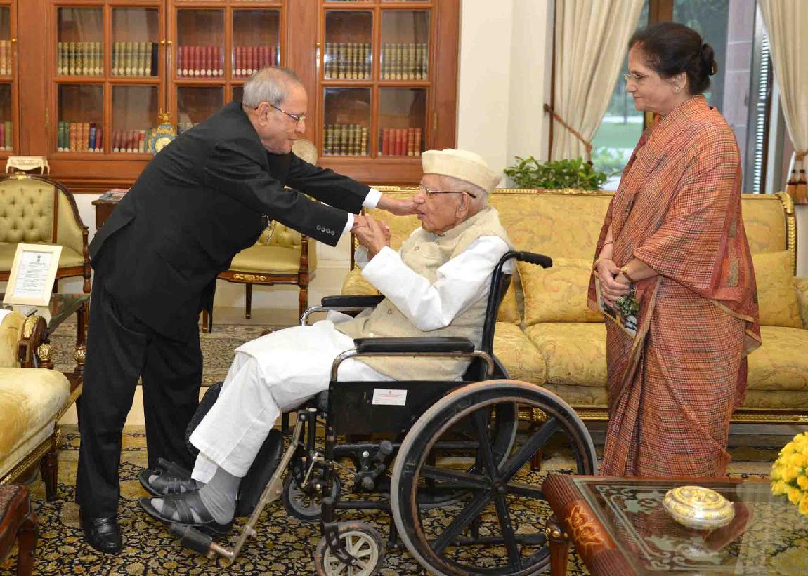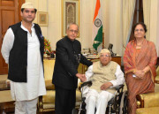 | Caption: | The President of India, Shri Pranab Mukherjee meeting with Shri Narayan Dutt Tiwari, former Governor of Andhra Pradesh alongwith his wife and son, at Rashtrapati Bhavan, in New Delhi on September 07, 2015. |