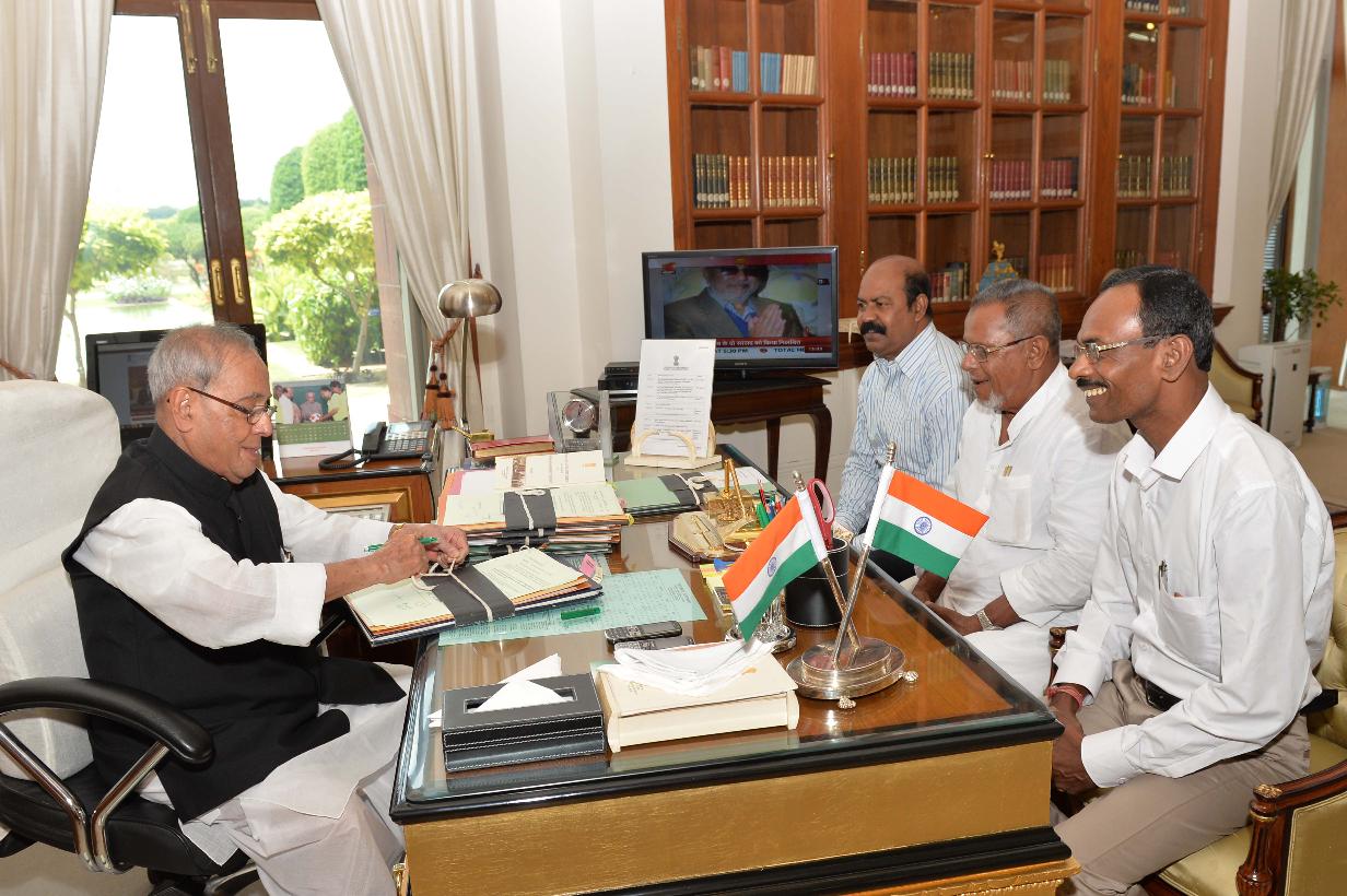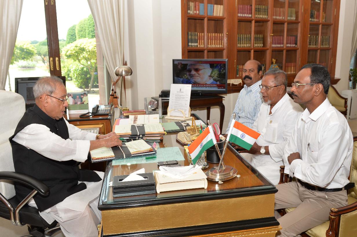| Caption: | The President of India, Shri Pranab Mukherjee meeting with Shri Kaji Abdul Razzak, President, Howrah District Congress Committee, Shri Alok Koley, Secretary, West Bengal Pradesh Congress Committee and Shri Debu Roy from Kolkata, at Rashtrapati Bhavan, in New Delhi on August 30, 2015. |
