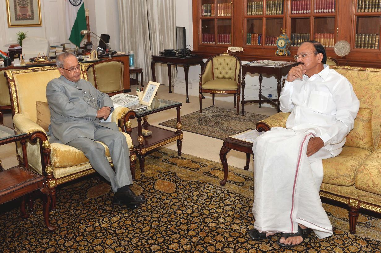 | Caption: | The President of India, Shri Pranab Mukherjee meeting with the Minister of Urban Development, Housing & Urban Poverty Alleviation and Parliamentary Affairs, Shri M. Venkaiah Naidu, at Rashtrapati Bhavan, in New Delhi on September 08, 2015. |
