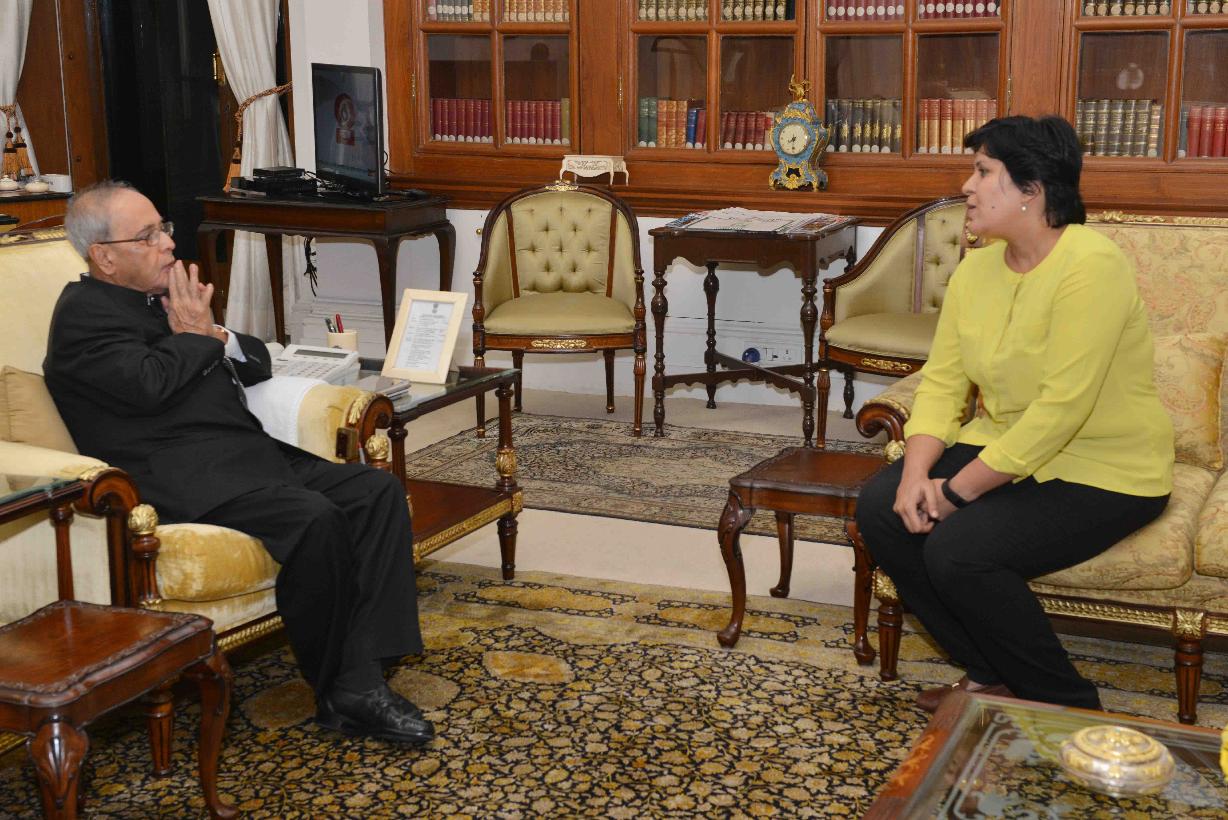 | Caption: | The President of India, Shri Pranab Mukherjee meeting with Ms. Supriya Shrinate, Chief Editor-News, ET Now, at Rashtrapati Bhavan, in New Delhi on September 09, 2015. |