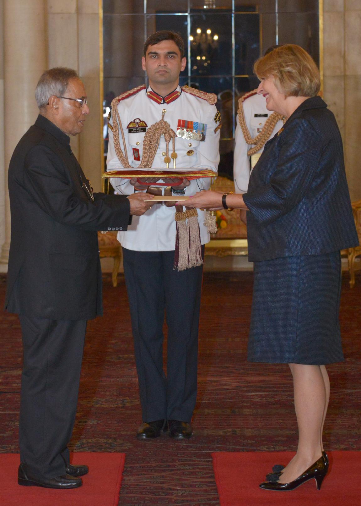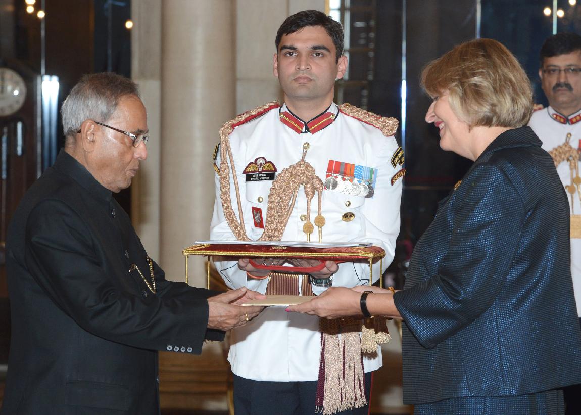 | Caption: | HE Mrs Darja Bavdaz Kuret, Ambassador-Designate of the Republic of Slovenia presenting her Credential to the President of India, Shri Pranab Mukherjee at Rashtrapati Bhavan in New Delhi on Oct 23, 2013 |