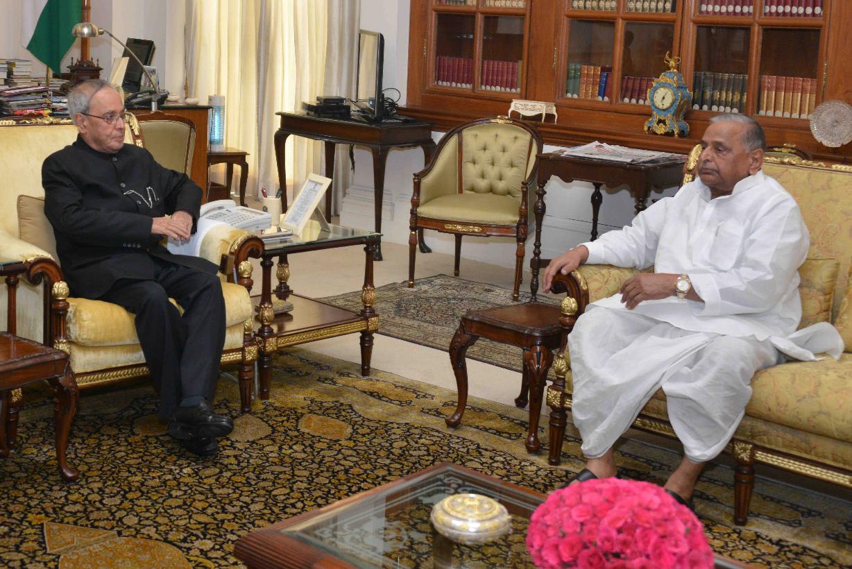 | Caption: | The President of India, Shri Pranab Mukherjee meeting with Shri Mulayam Singh Yadav, MP (LS), at Rashtrapati Bhavan, in New Delhi on August 19, 2015. |